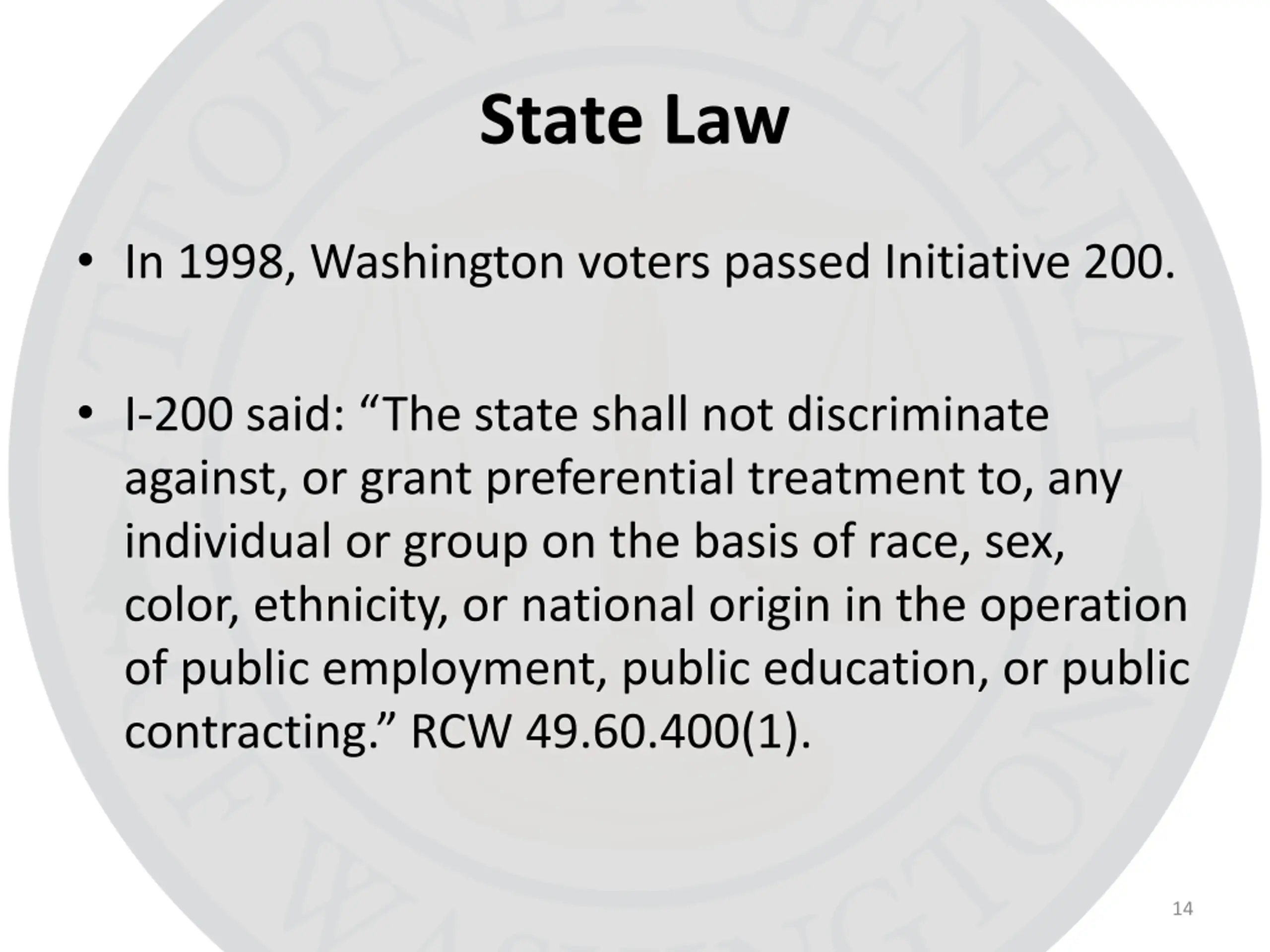 State Law In 1998, Washington voters passed Initiative 200. I-200 said: The state shall not discriminate against, or grant preferential treatment to, any individual or group on the basis of race, sex, color, ethnicity, or national origin in the operation of public employment, public education, or public contracting. RCW 49.60.400(1). 14