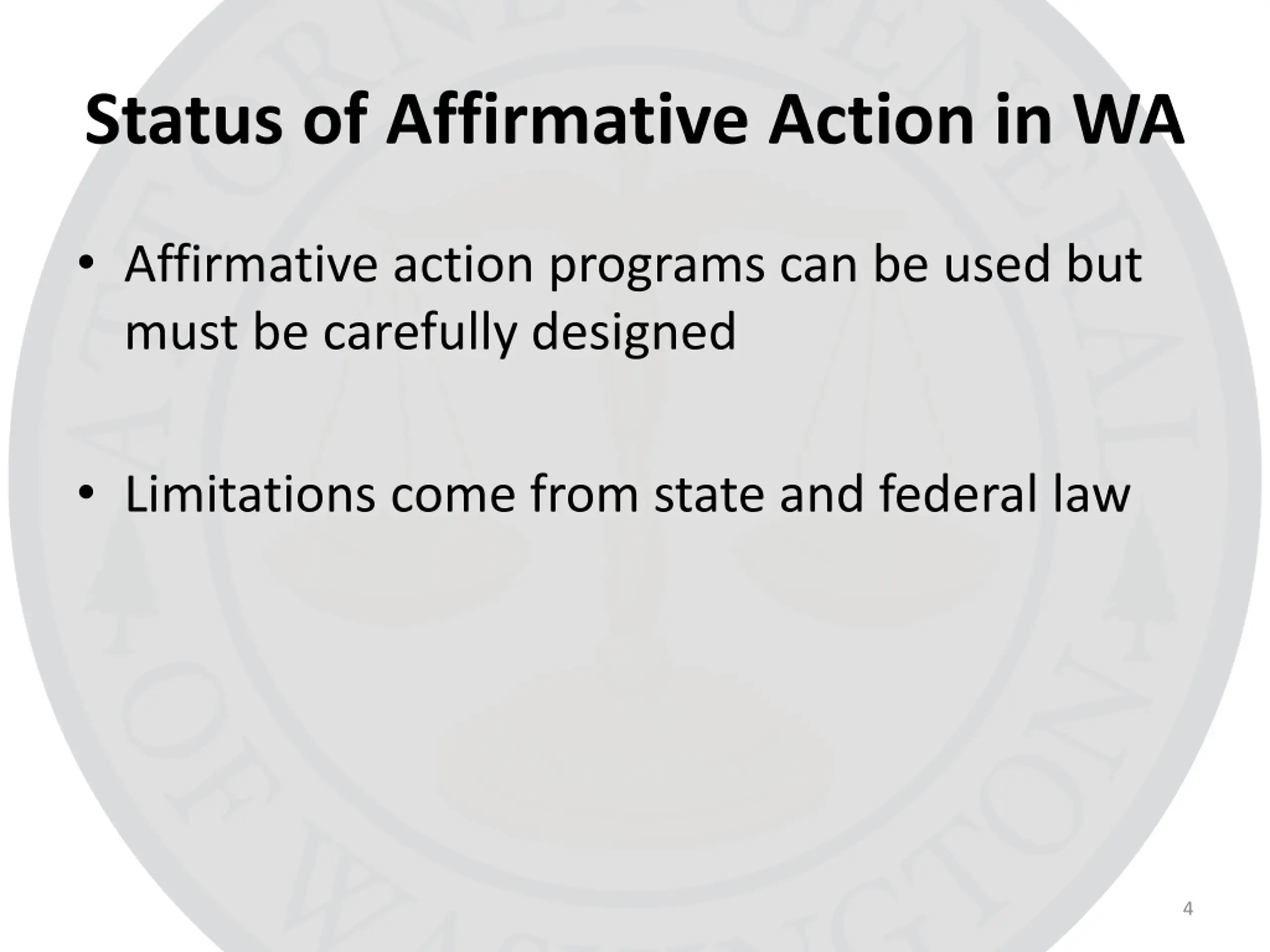 Status of Affirmative Action in WA Affirmative action programs can be used but must be carefully designed Limitations come from state and federal law 4