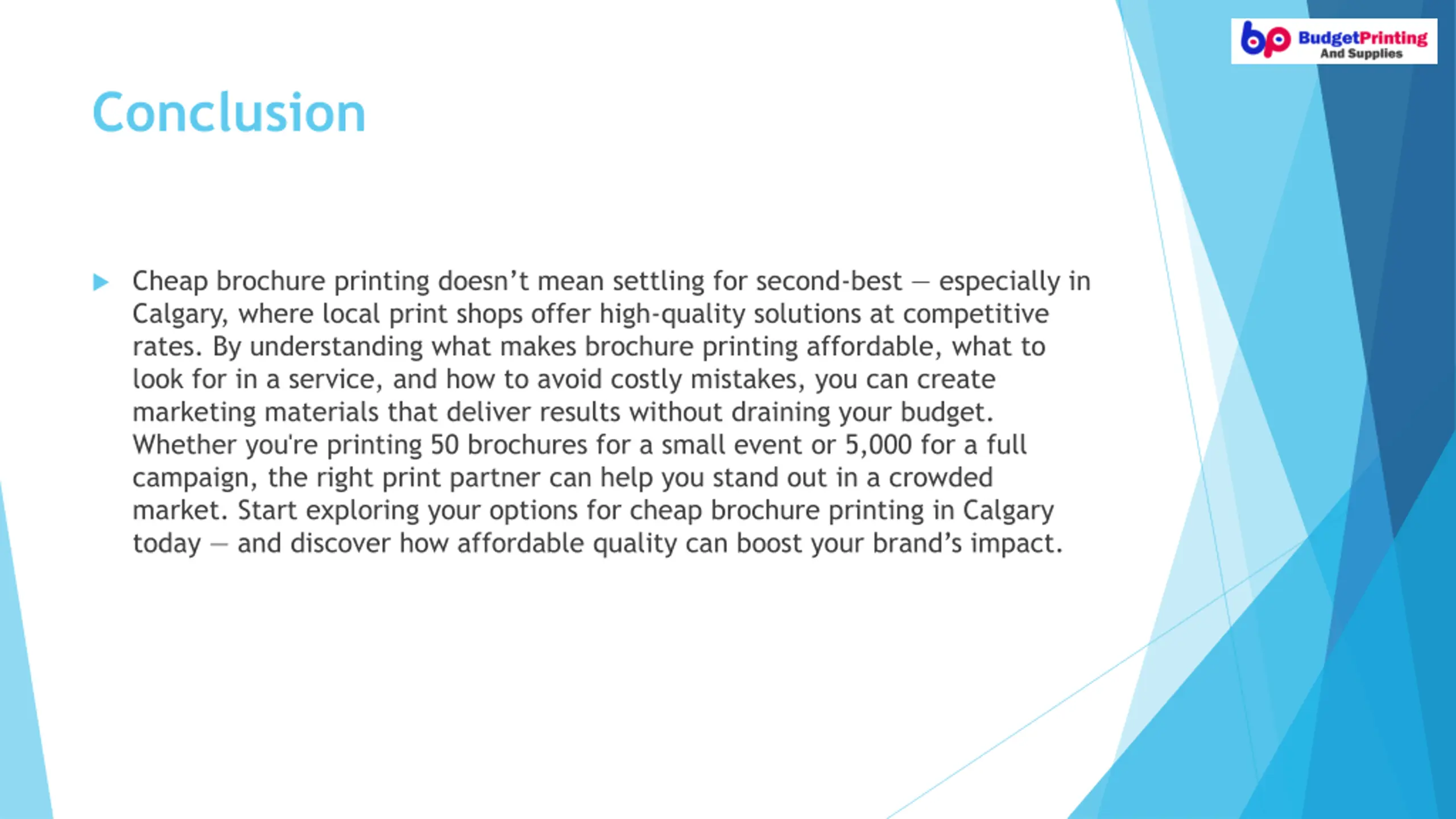 Conclusion Cheap brochure printing doesn t mean settling for second-best especially in Calgary, where local print shops offer high-quality solutions at competitive rates. By understanding what makes brochure printing affordable, what to look for in a service, and how to avoid costly mistakes, you can create marketing materials that deliver results without draining your budget. Whether you're printing 50 brochures for a small event or 5,000 for a full campaign, the right print partner can help you stand out in a crowded market. Start exploring your options for cheap brochure printing in Calgary today and discover how affordable quality can boost your brand s impact.