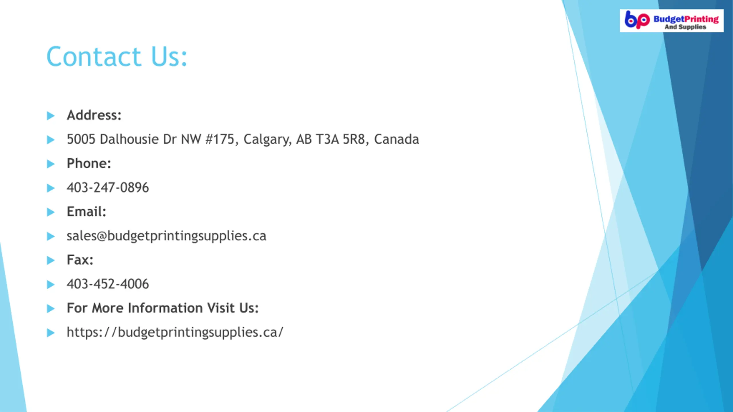 Contact Us: Address: 5005 Dalhousie Dr NW #175, Calgary, AB T3A 5R8, Canada Phone: 403-247-0896 Email: sales@budgetprintingsupplies.ca Fax: 403-452-4006 For More Information Visit Us: https://budgetprintingsupplies.ca/