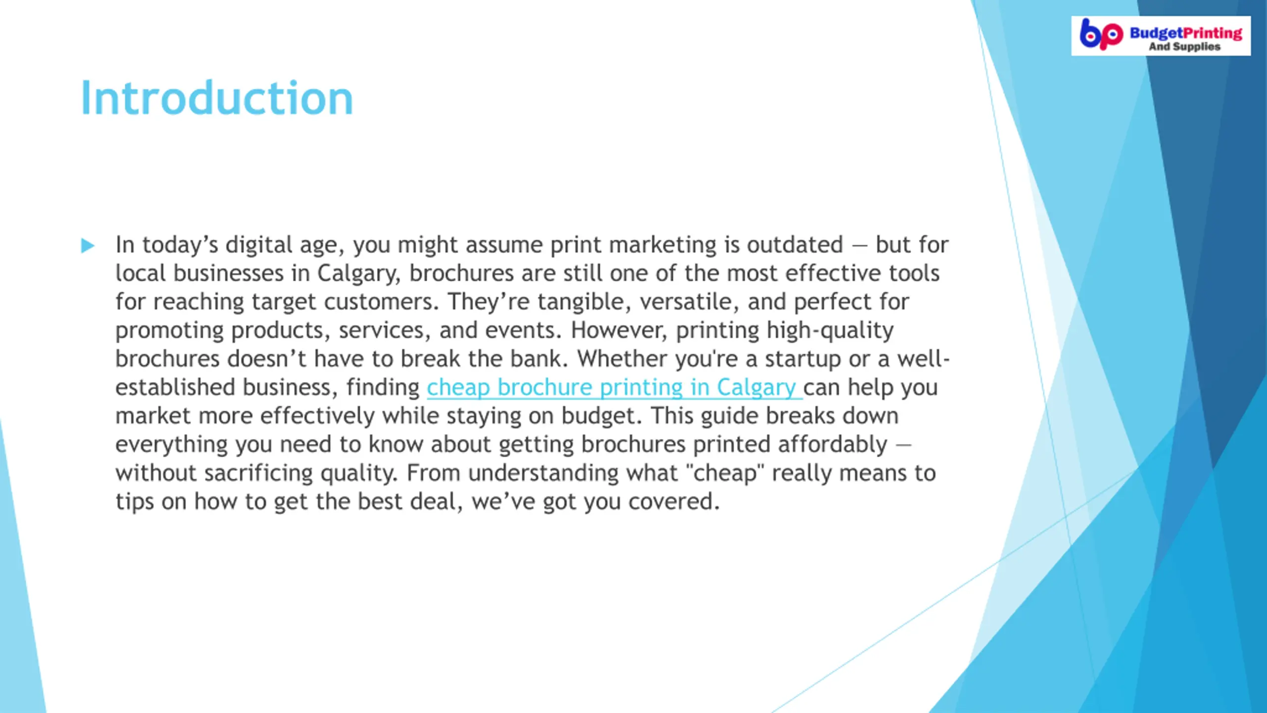 2. What Cheap Really Means in Brochure Printing When people hear the word cheap, they often think it means poor quality. But in the world of printing, cheap can simply mean cost-effective. Many local Calgary print shops offer cheap brochure printing in Calgary by using efficient production methods, bulk pricing, and standard-size templates. You re not cutting corners you re making smart choices. The price depends on several factors, such as paper type, size, number of folds, color vs. black- and-white, and turnaround time. A glossy tri-fold brochure, for instance, may cost more than a simple single-fold matte version. Understanding what you re paying for helps you make informed decisions that fit your budget.