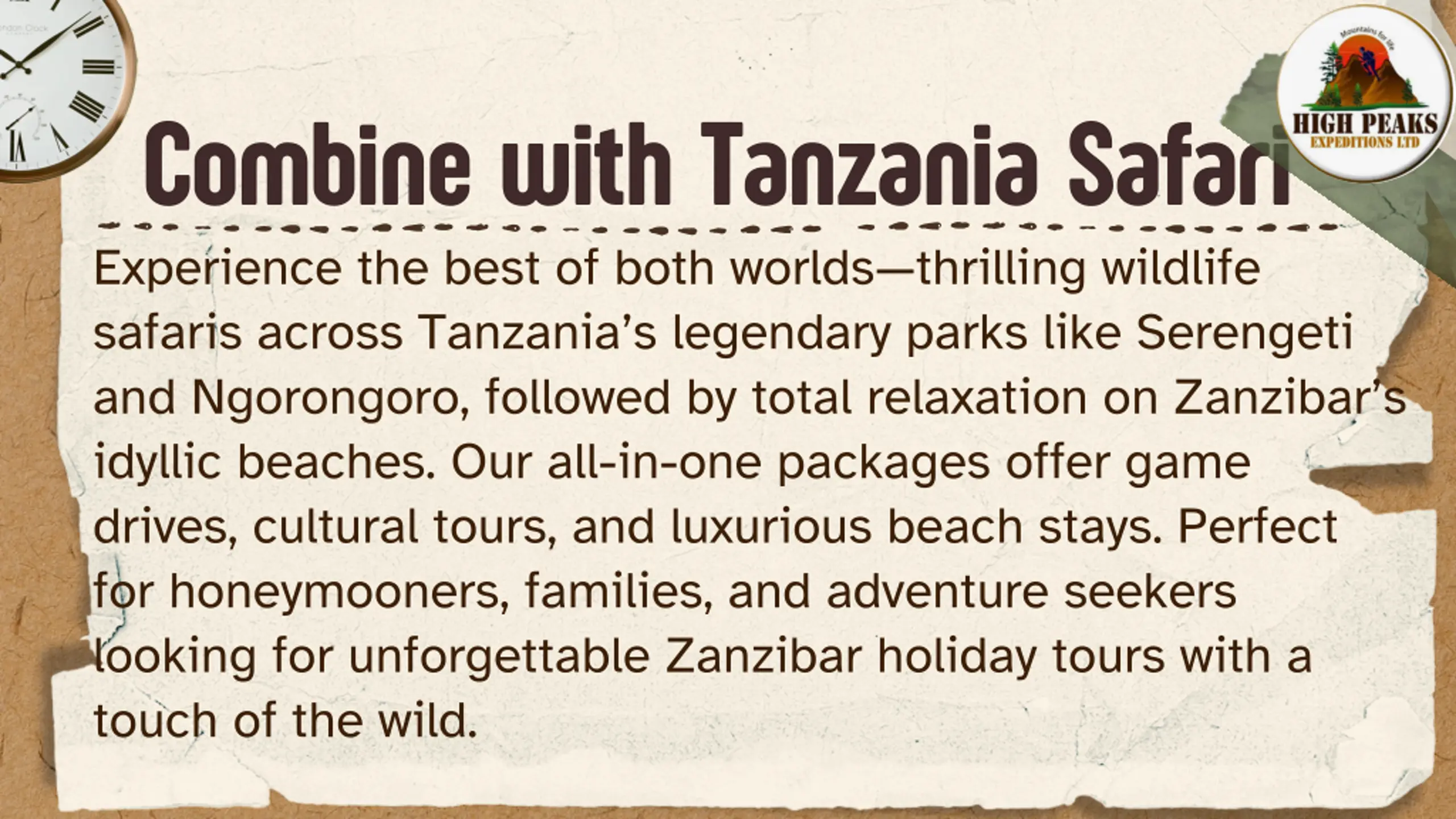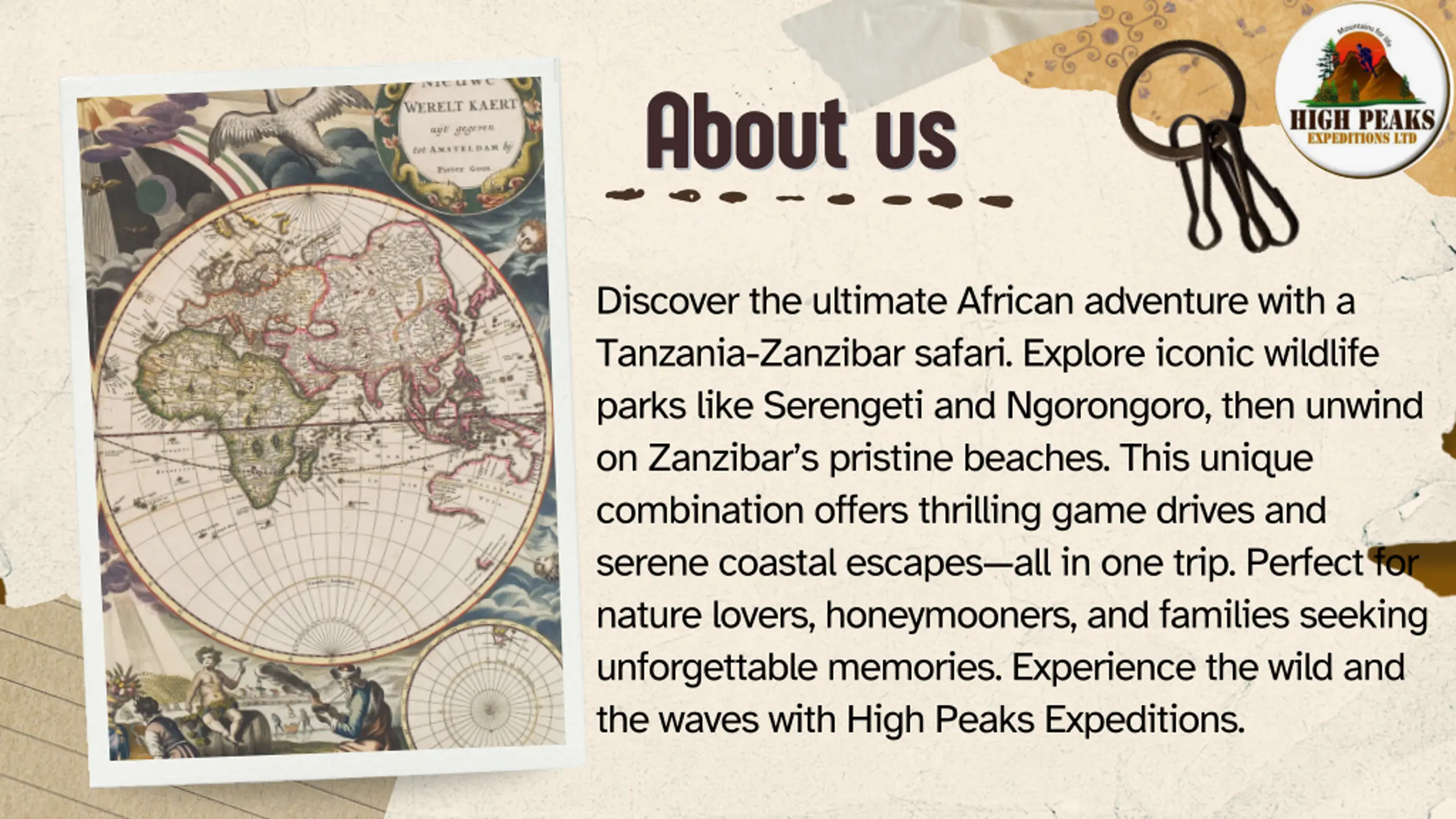 About us About us Discover the ultimate African adventure with a Tanzania-Zanzibar safari. Explore iconic wildlife parks like Serengeti and Ngorongoro, then unwind on Zanzibar s pristine beaches. This unique combination offers thrilling game drives and serene coastal escapes all in one trip. Perfect for nature lovers, honeymooners, and families seeking unforgettable memories. Experience the wild and the waves with High Peaks Expeditions.