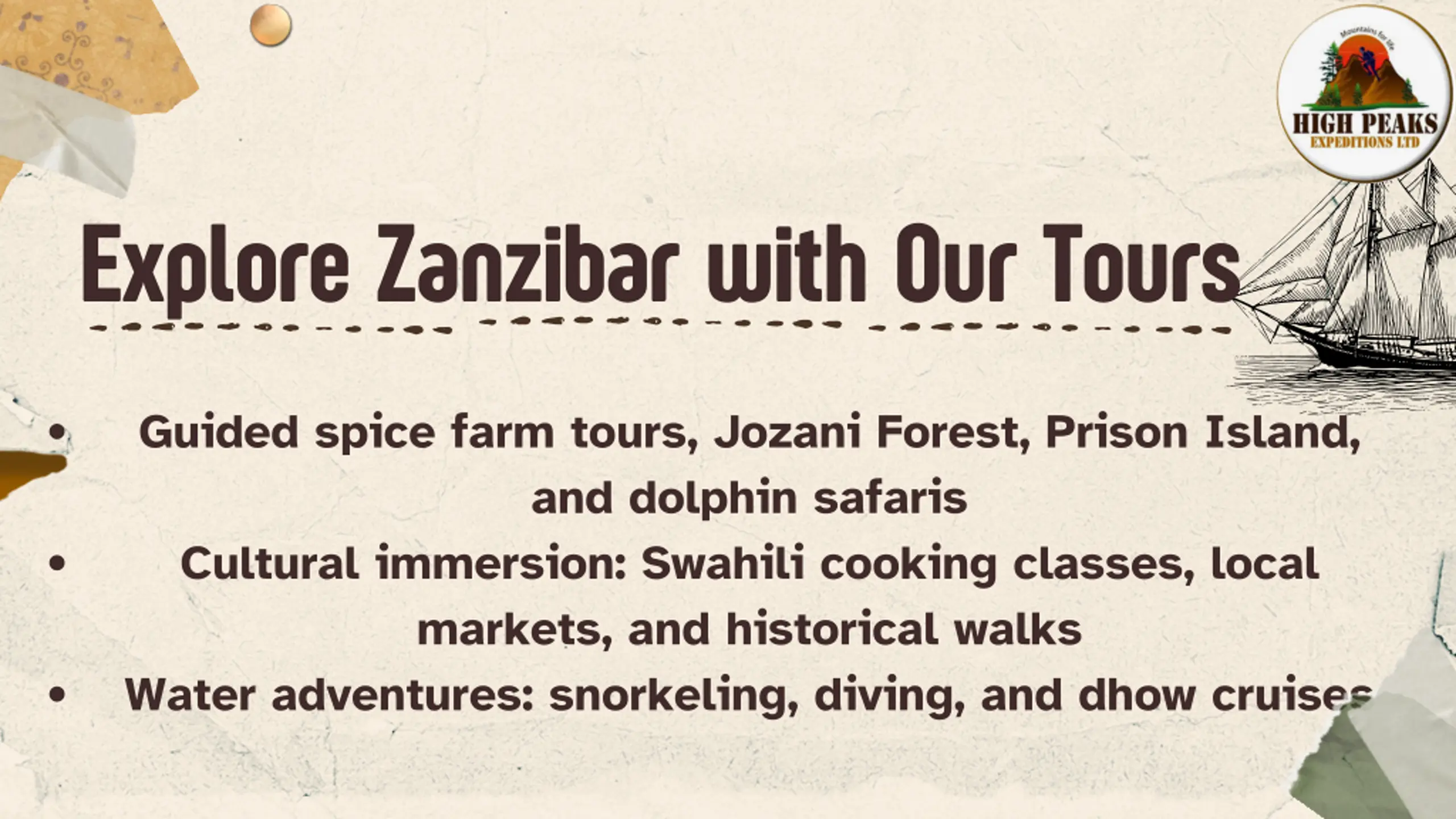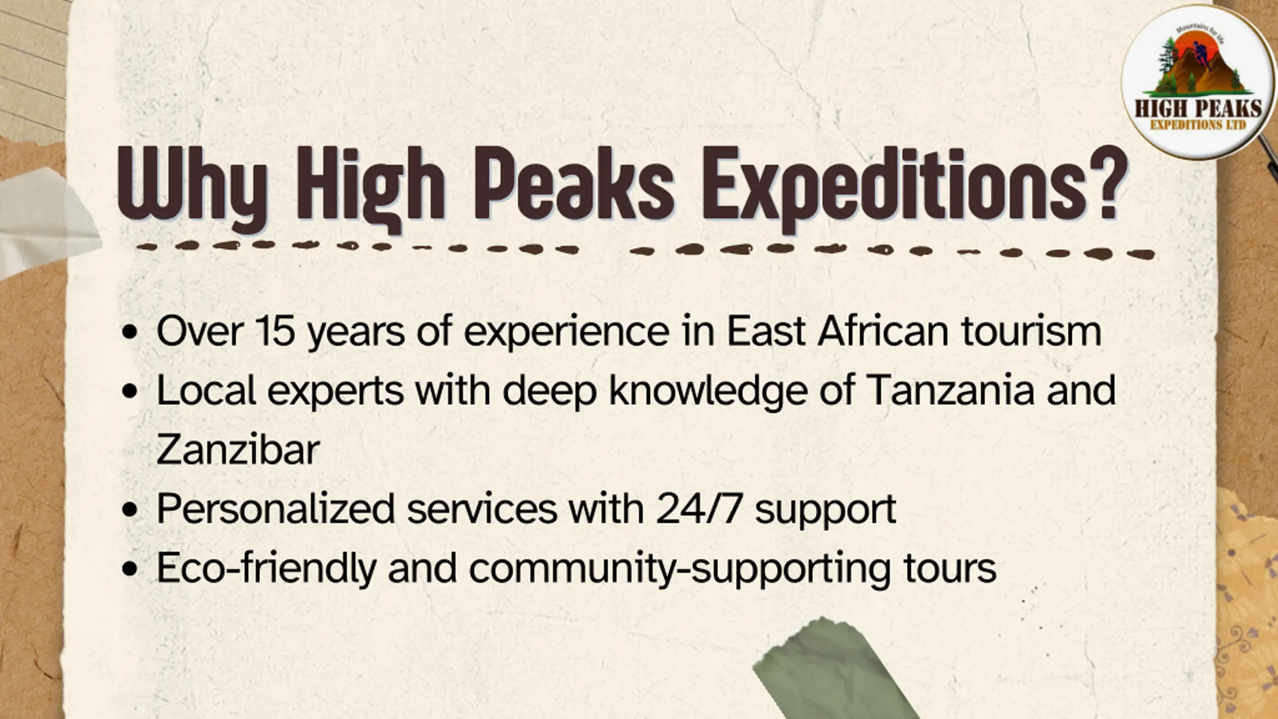 Why High Peaks Expeditions? Why High Peaks Expeditions? Over 15 years of experience in East African tourism Local experts with deep knowledge of Tanzania and Zanzibar Personalized services with 24/7 support Eco-friendly and community-supporting tours