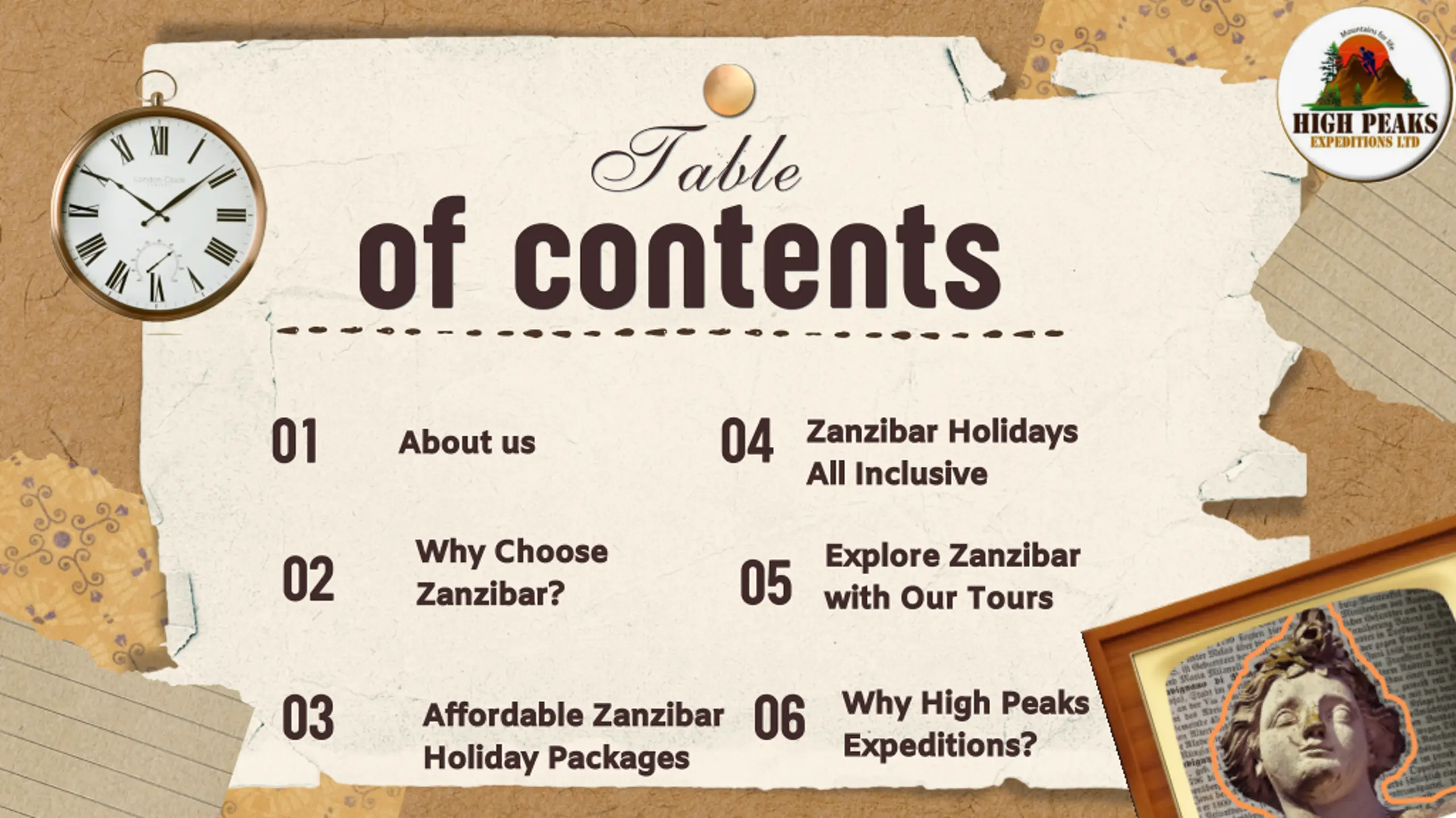Table Table of contents of contents 04 01 Zanzibar Holidays All Inclusive About us Why Choose Zanzibar? Explore Zanzibar with Our Tours 02 05 03 06 Why High Peaks Expeditions? Affordable Zanzibar Holiday Packages