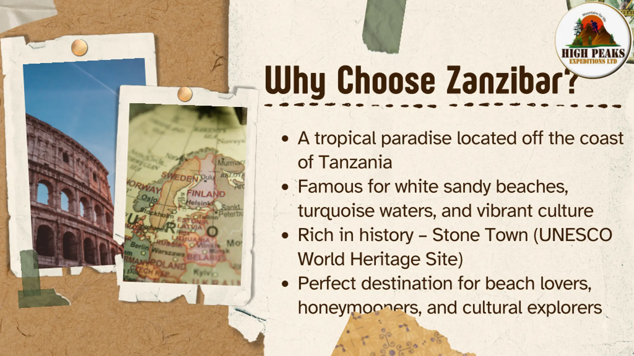 Why Choose Zanzibar? A tropical paradise located off the coast of Tanzania Famous for white sandy beaches, turquoise waters, and vibrant culture Rich in history Stone Town (UNESCO World Heritage Site) Perfect destination for beach lovers, honeymooners, and cultural explorers