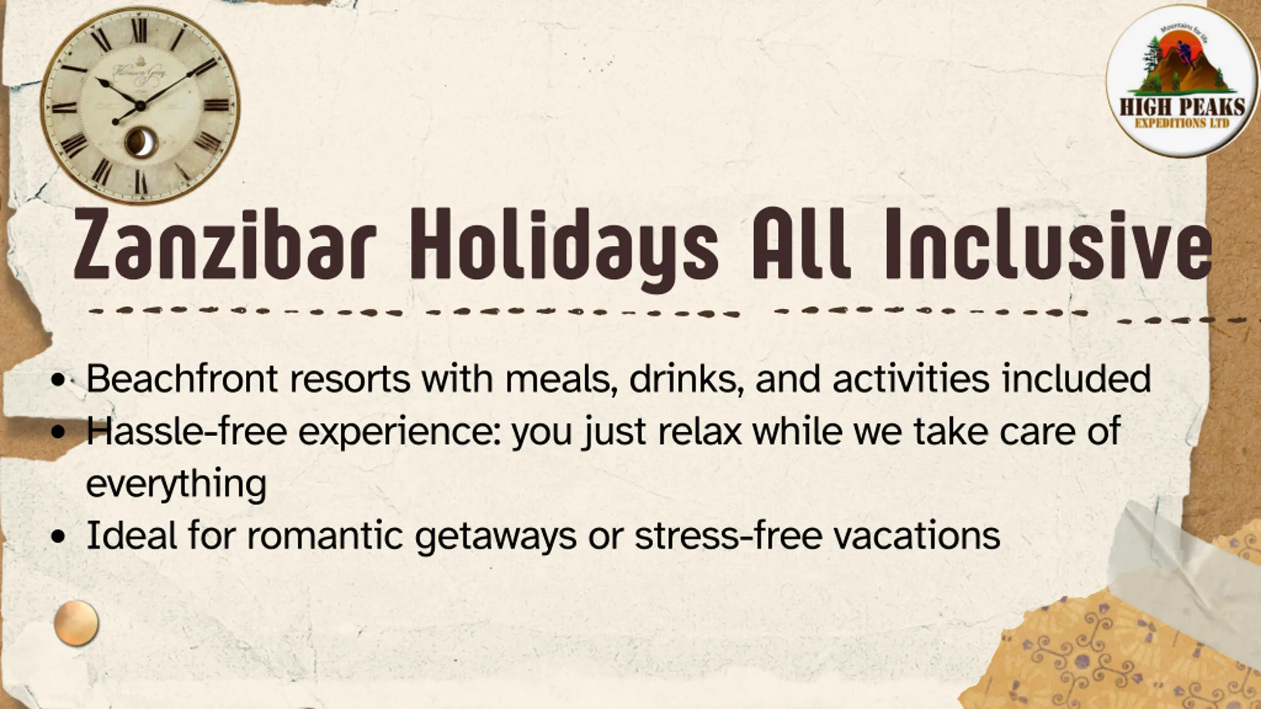 Zanzibar Holidays All Inclusive Beachfront resorts with meals, drinks, and activities included Hassle-free experience: you just relax while we take care of everything Ideal for romantic getaways or stress-free vacations