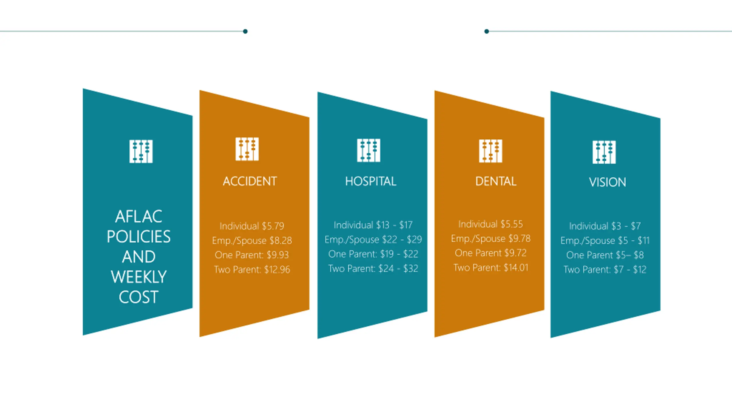 ACCIDENT ACCIDENT ACCIDENT ACCIDENT HOSPITAL HOSPITAL DENTAL DENTAL VISION VISION AFLAC AFLAC POLICIES POLICIES AND AND WEEKLY WEEKLY COST COST Individual $5.55 Emp./Spouse $9.78 One Parent $9.72 Two Parent: $14.01 Individual $13 - $17 Emp./Spouse $22 - $29 One Parent: $19 - $22 Two Parent: $24 - $32 Individual $5.79 Emp./Spouse $8.28 One Parent: $9.93 Two Parent: $12.96 Individual $3 - $7 Emp./Spouse $5 - $11 One Parent $5 $8 Two Parent: $7 - $12
