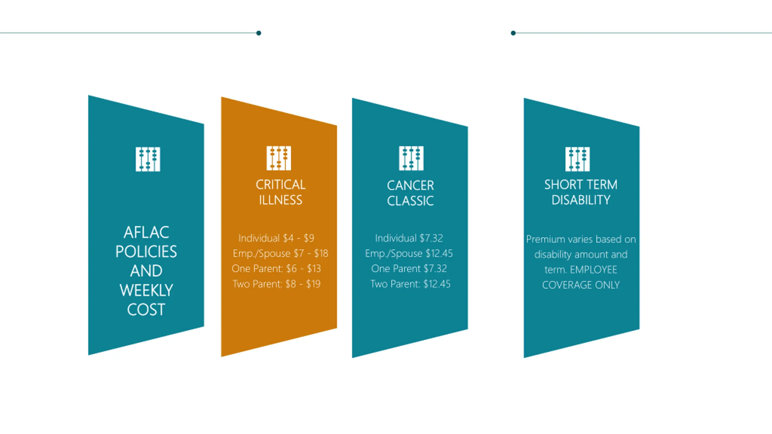CRITICAL CRITICAL ILLNESS ILLNESS SHORT TERM SHORT TERM DISABILITY DISABILITY CANCER CANCER CLASSIC CLASSIC CANCER CANCER AFLAC AFLAC POLICIES POLICIES AND AND WEEKLY WEEKLY COST COST Individual $4 - $9 Emp./Spouse $7 - $18 One Parent: $6 - $13 Two Parent: $8 - $19 Individual $7.32 Emp./Spouse $12.45 One Parent $7.32 Two Parent: $12.45 Premium varies based on disability amount and term. EMPLOYEE COVERAGE ONLY