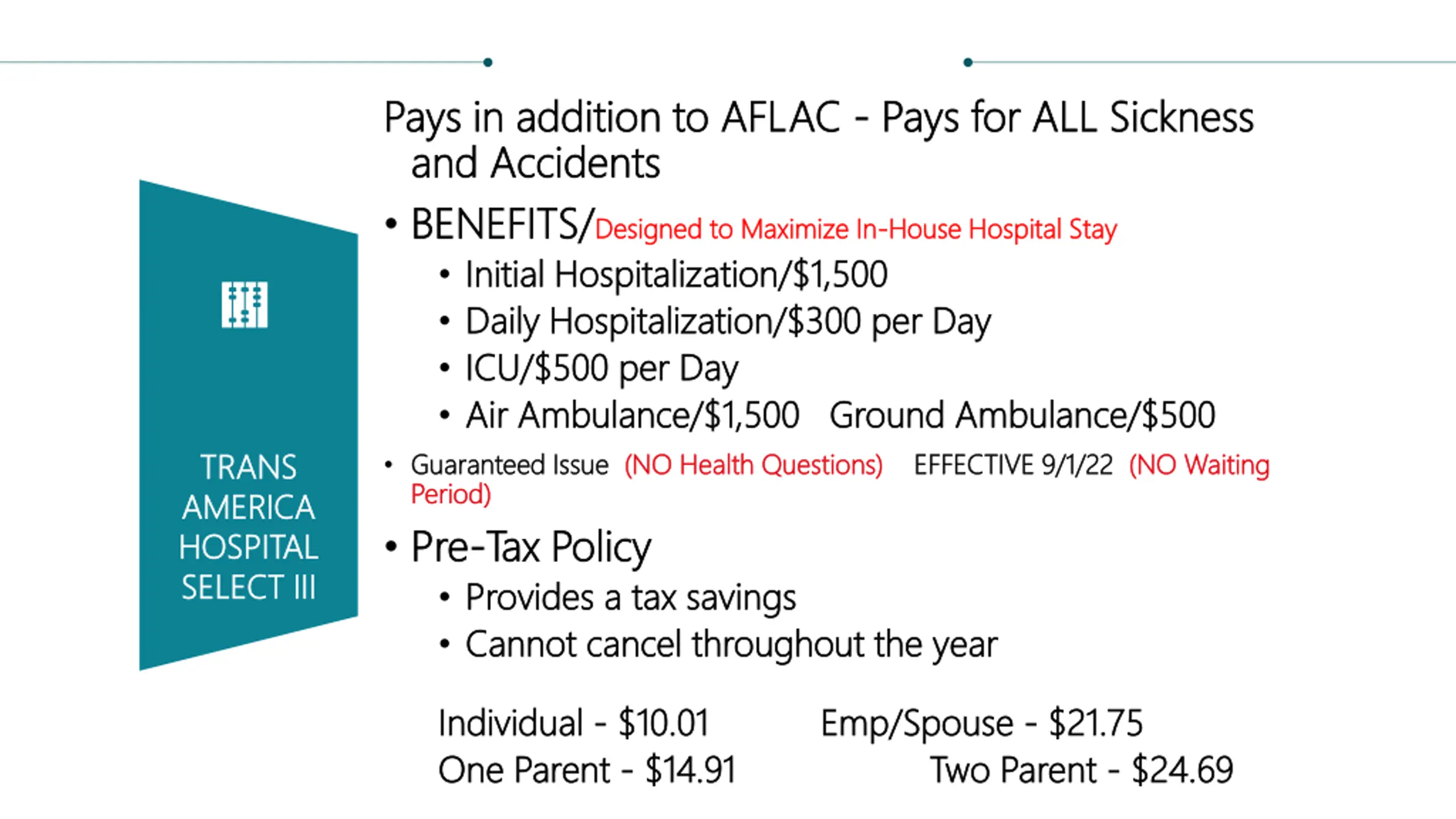 Pays in addition to AFLAC Pays in addition to AFLAC - - Pays for ALL Sickness and Accidents and Accidents BENEFITS/ BENEFITS/Designed to Maximize In Designed to Maximize In- -House Hospital Stay Initial Hospitalization/$1,500 Initial Hospitalization/$1,500 Daily Hospitalization/$300 per Day Daily Hospitalization/$300 per Day ICU/$500 per Day ICU/$500 per Day Air Ambulance/$1,500 Ground Ambulance/$500 Air Ambulance/$1,500 Ground Ambulance/$500 Guaranteed Issue Guaranteed Issue (NO Health Questions) (NO Health Questions) Period) Period) Pre Pre- -Tax Policy Tax Policy Provides a tax savings Provides a tax savings Cannot cancel throughout the year Cannot cancel throughout the year Pays for ALL Sickness House Hospital Stay FINANCIAL FINANCIAL ANALYSIS ANALYSIS ECONOMIC ECONOMIC ANALYSIS ANALYSIS ECOLOGICAL ECOLOGICAL ANALYSIS ANALYSIS (NO Waiting TRANS TRANS AMERICA AMERICA HOSPITAL HOSPITAL SELECT III SELECT III EFFECTIVE 9/1/22 EFFECTIVE 9/1/22 (NO Waiting Individual Individual - - $10.01 One Parent One Parent - - $14.91 $10.01 $14.91 Emp/Spouse Emp/Spouse - - $21.75 Two Parent Two Parent - - $24.69 $21.75 $24.69