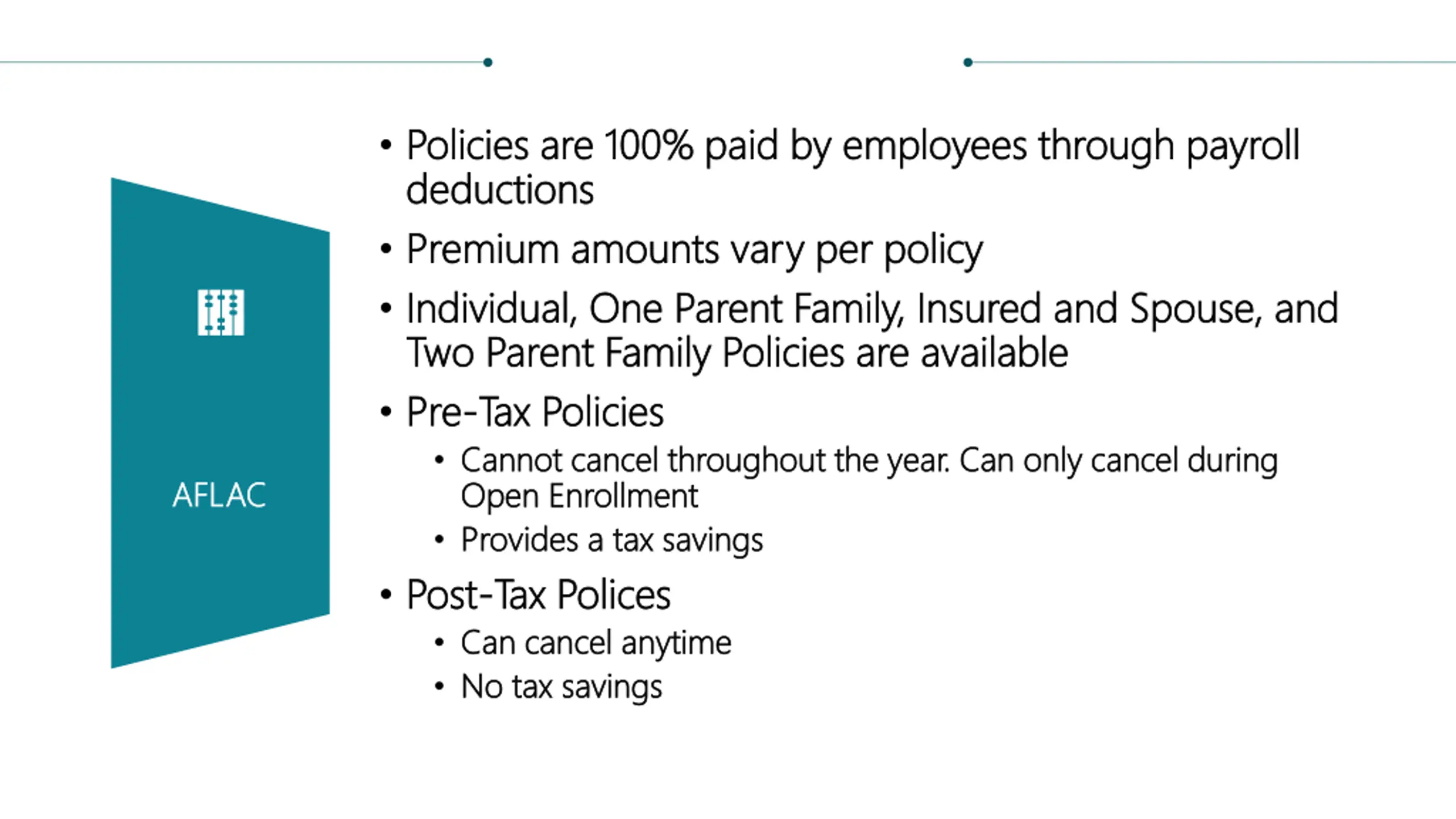Policies are 100% paid by employees through payroll Policies are 100% paid by employees through payroll deductions deductions Premium amounts vary per policy Premium amounts vary per policy Individual, One Parent Family, Insured and Spouse, and Individual, One Parent Family, Insured and Spouse, and Two Parent Family Policies are available Two Parent Family Policies are available Pre Pre- -Tax Policies Tax Policies Cannot cancel throughout the year. Can only cancel during Cannot cancel throughout the year. Can only cancel during Open Enrollment Open Enrollment Provides a tax savings Provides a tax savings Post Post- -Tax Polices Tax Polices Can cancel anytime Can cancel anytime No tax savings No tax savings FINANCIAL FINANCIAL ANALYSIS ANALYSIS ECONOMIC ECONOMIC ANALYSIS ANALYSIS ECOLOGICAL ECOLOGICAL ANALYSIS ANALYSIS AFLAC AFLAC