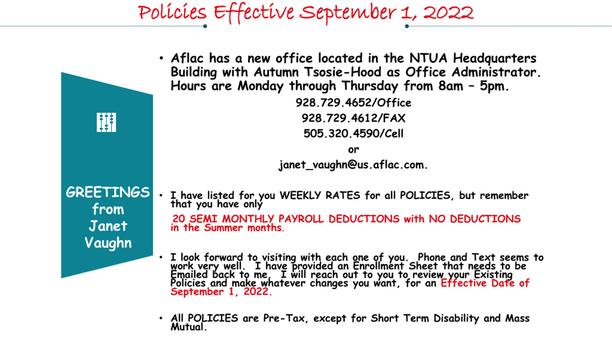 Policies Effective September 1, 2022 Policies Effective September 1, 2022 Aflac has a new office located in the NTUA Headquarters Building with Autumn Tsosie-Hood as Office Administrator. Hours are Monday through Thursday from 8am 5pm. 928.729.4652/Office 928.729.4612/FAX 505.320.4590/Cell or FINANCIAL FINANCIAL ANALYSIS ANALYSIS janet_vaughn@us.aflac.com. ECONOMIC ECONOMIC ANALYSIS ANALYSIS ECOLOGICAL ECOLOGICAL ANALYSIS ANALYSIS GREETINGS from Janet Vaughn I have listed for you WEEKLY RATES for all POLICIES, but remember that you have only 20 SEMI MONTHLY PAYROLL DEDUCTIONS with NO DEDUCTIONS in the Summer months. I look forward to visiting with each one of you. Phone and Text seems to work very well. I have provided an Enrollment Sheet that needs to be Emailed back to me. I will reach out to you to review your Existing Policies and make whatever changes you want, for an Effective Date of September 1, 2022. All POLICIES are Pre-Tax, except for Short Term Disability and Mass Mutual.