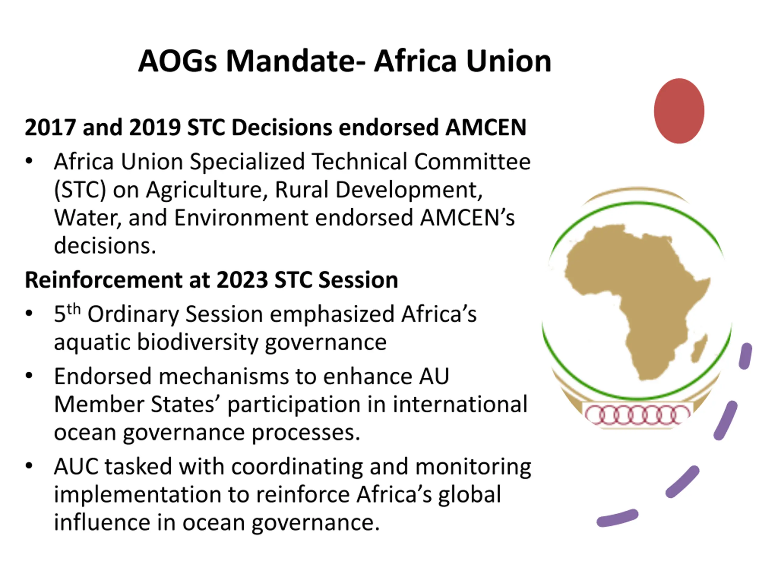 AOGs Mandate- Africa Union 2017 and 2019 STC Decisions endorsed AMCEN Africa Union Specialized Technical Committee (STC) on Agriculture, Rural Development, Water, and Environment endorsed AMCEN s decisions. Reinforcement at 2023 STC Session 5thOrdinary Session emphasized Africa s aquatic biodiversity governance Endorsed mechanisms to enhance AU Member States participation in international ocean governance processes. AUC tasked with coordinating and monitoring implementation to reinforce Africa s global influence in ocean governance.