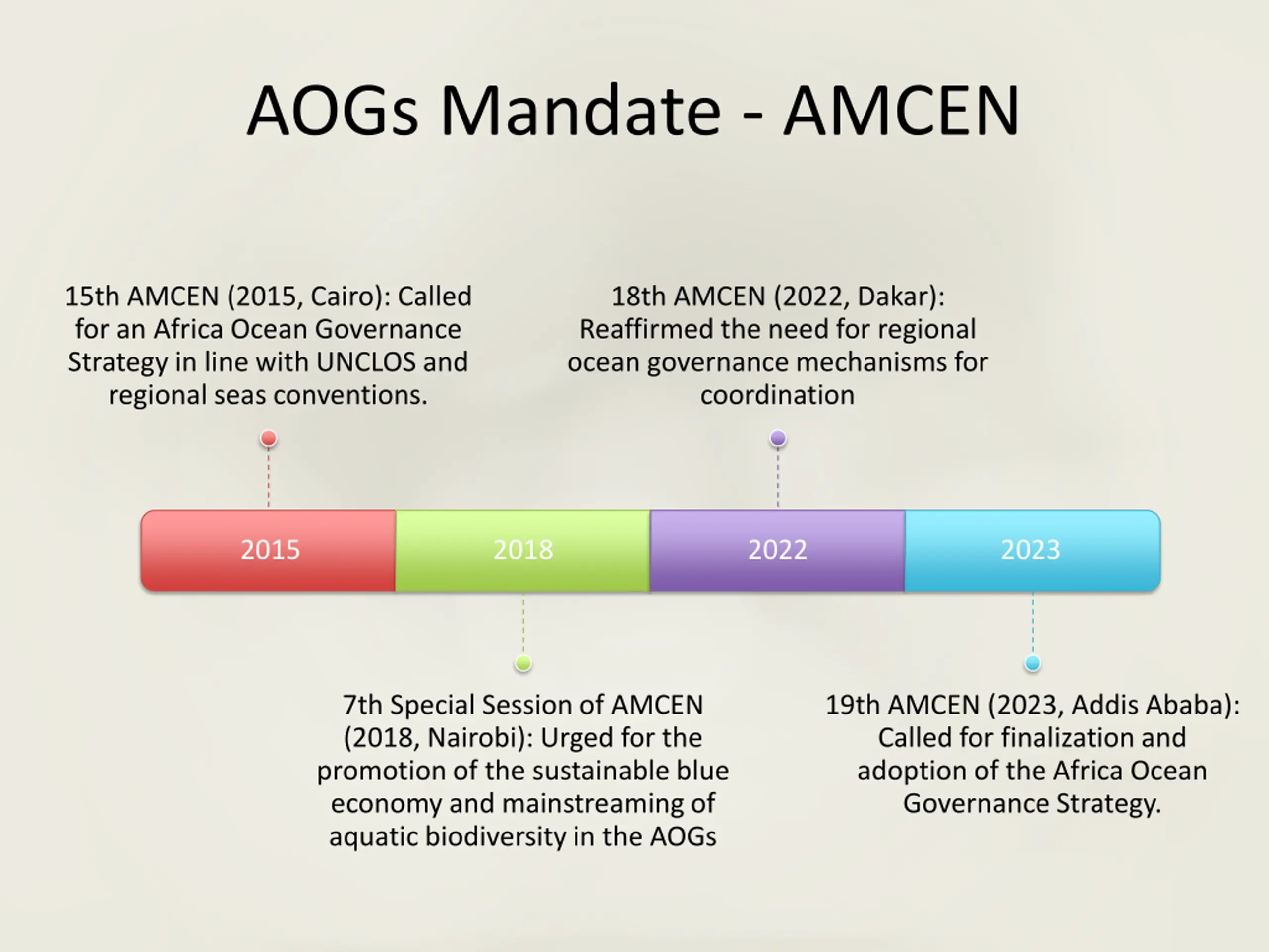 AOGs Mandate - AMCEN 15th AMCEN (2015, Cairo): Called for an Africa Ocean Governance Strategy in line with UNCLOS and regional seas conventions. 18th AMCEN (2022, Dakar): Reaffirmed the need for regional ocean governance mechanisms for coordination 2015 2018 2022 2023 7th Special Session of AMCEN (2018, Nairobi): Urged for the promotion of the sustainable blue economy and mainstreaming of aquatic biodiversity in the AOGs 19th AMCEN (2023, Addis Ababa): Called for finalization and adoption of the Africa Ocean Governance Strategy.