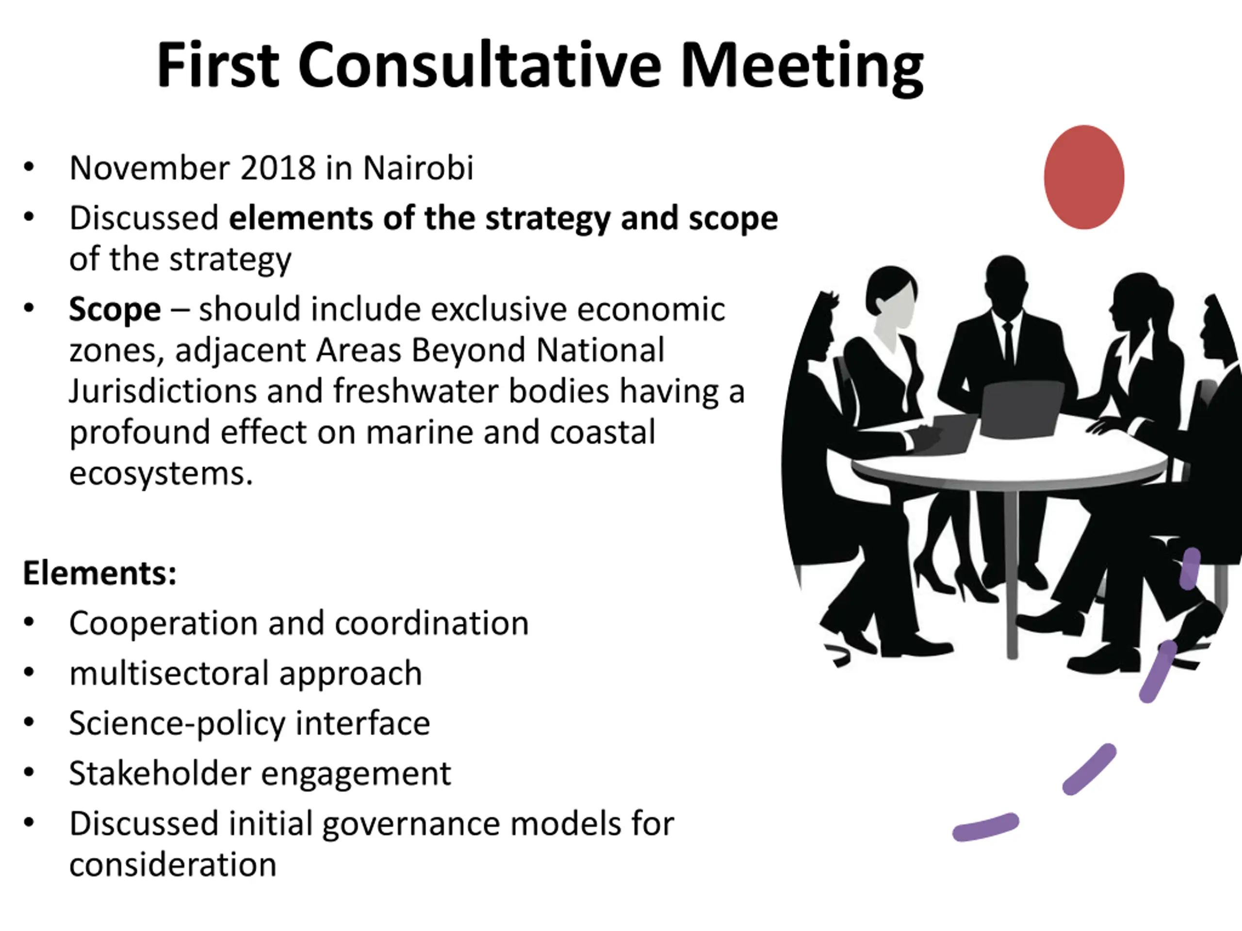 First Consultative Meeting November 2018 in Nairobi Discussed elements of the strategy and scope of the strategy Scope should include exclusive economic zones, adjacent Areas Beyond National Jurisdictions and freshwater bodies having a profound effect on marine and coastal ecosystems. Elements: Cooperation and coordination multisectoral approach Science-policy interface Stakeholder engagement Discussed initial governance models for consideration