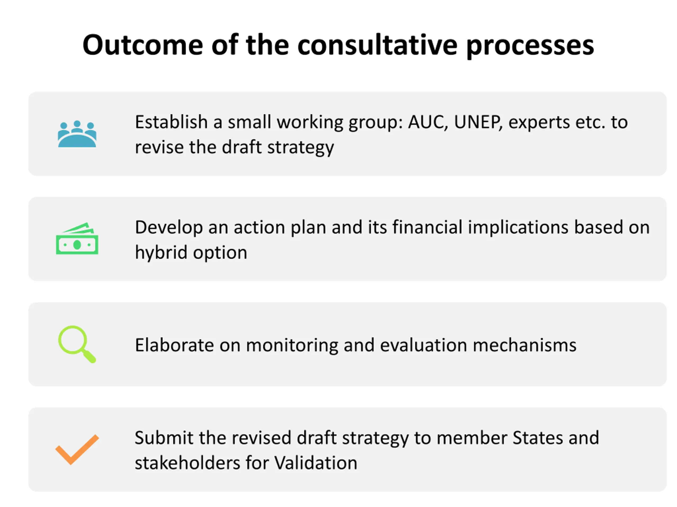 Outcome of the consultative processes Establish a small working group: AUC, UNEP, experts etc. to revise the draft strategy Develop an action plan and its financial implications based on hybrid option Elaborate on monitoring and evaluation mechanisms Submit the revised draft strategy to member States and stakeholders for Validation