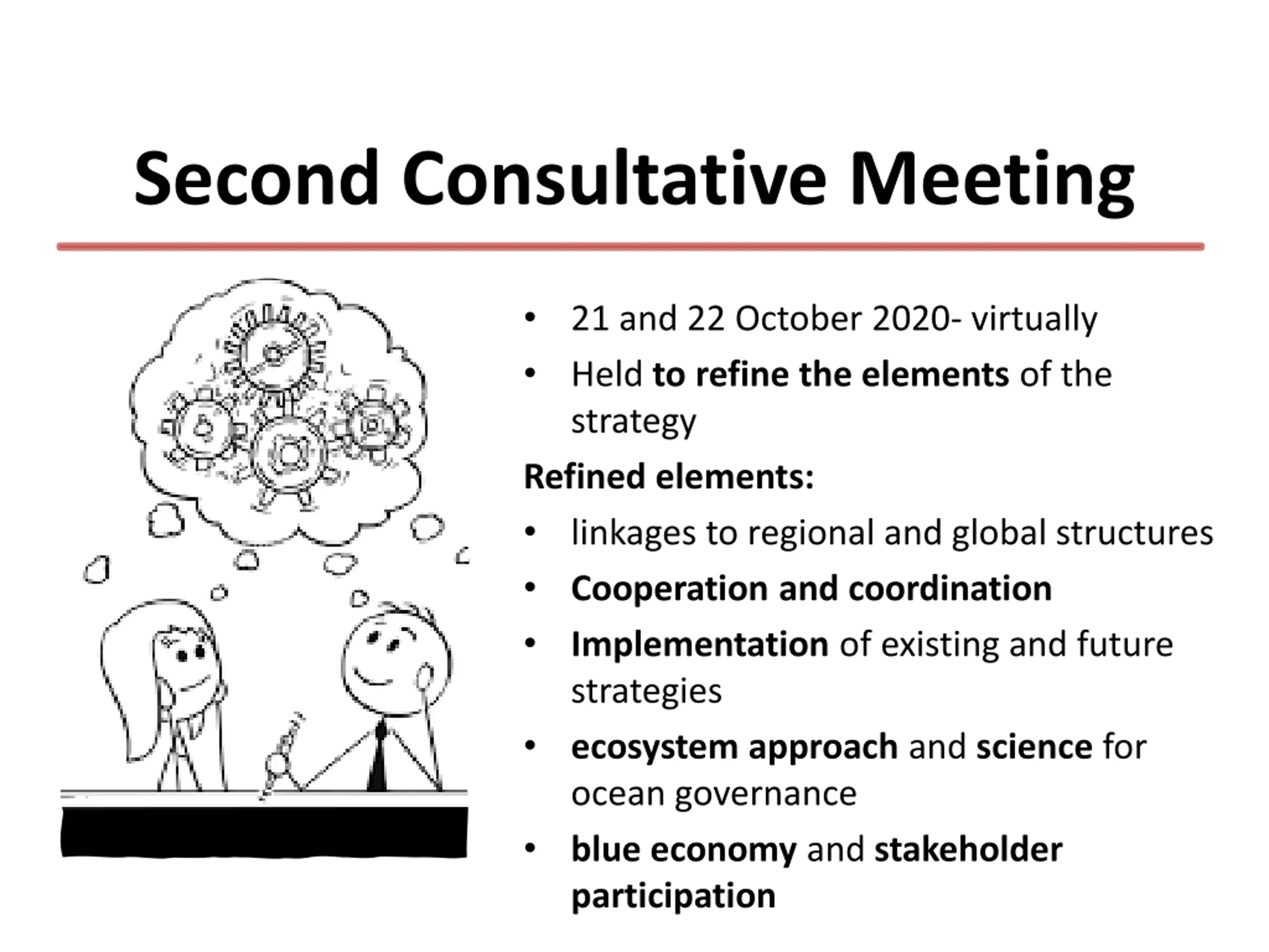 Second Consultative Meeting 21 and 22 October 2020- virtually Held to refine the elements of the strategy Refined elements: linkages to regional and global structures Cooperation and coordination Implementation of existing and future strategies ecosystem approach and science for ocean governance blue economy and stakeholder participation