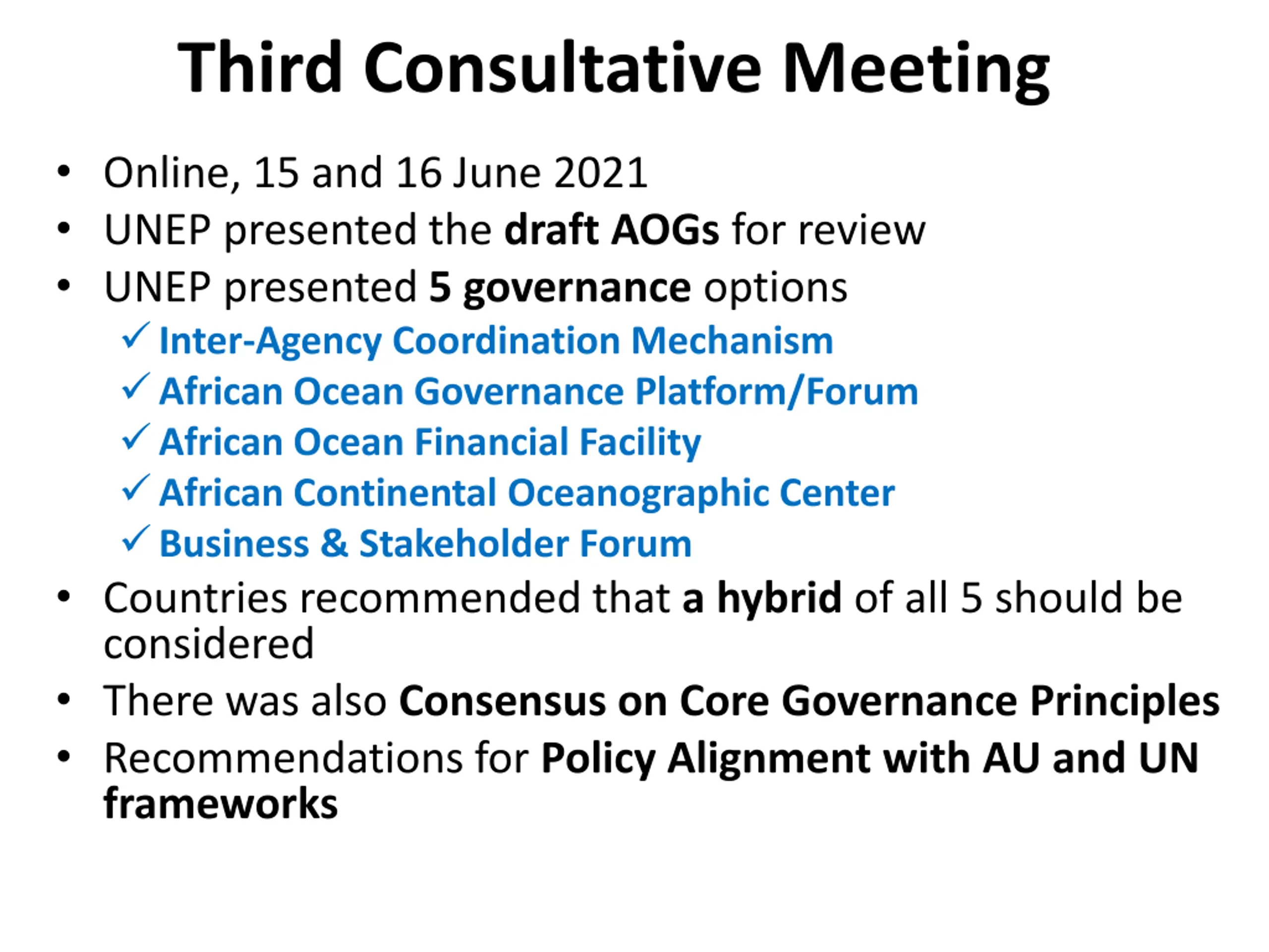 Third Consultative Meeting Online, 15 and 16 June 2021 UNEP presented the draft AOGs for review UNEP presented 5 governance options Inter-Agency Coordination Mechanism African Ocean Governance Platform/Forum African Ocean Financial Facility African Continental Oceanographic Center Business & Stakeholder Forum Countries recommended that a hybrid of all 5 should be considered There was also Consensus on Core Governance Principles Recommendations for Policy Alignment with AU and UN frameworks