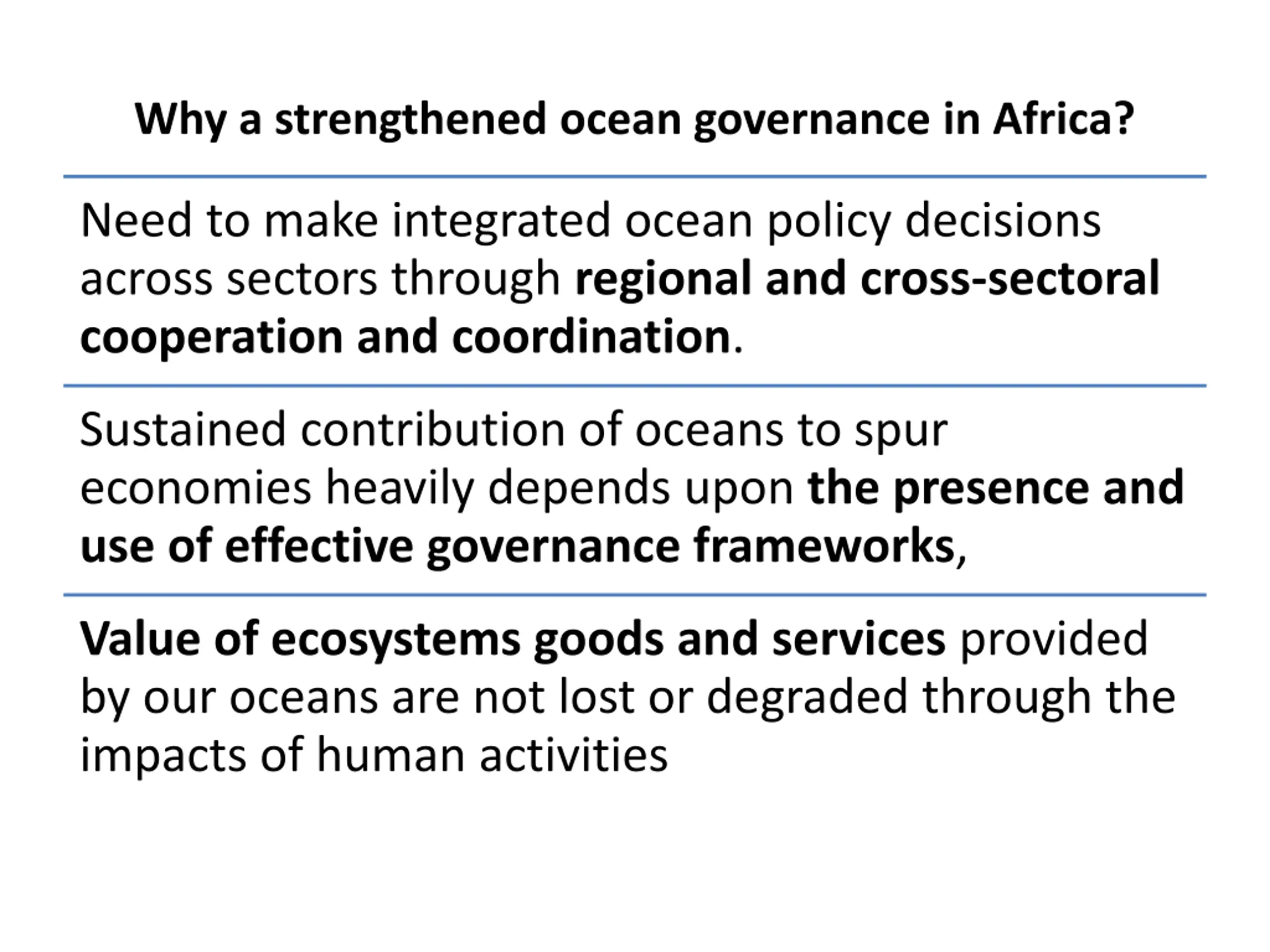 Why a strengthened ocean governance in Africa? Need to make integrated ocean policy decisions across sectors through regional and cross-sectoral cooperation and coordination. Sustained contribution of oceans to spur economies heavily depends upon the presence and use of effective governance frameworks, Value of ecosystems goods and services provided by our oceans are not lost or degraded through the impacts of human activities