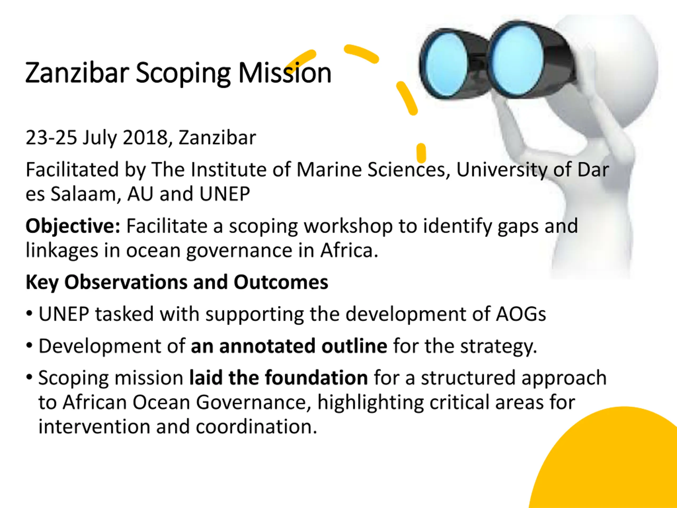 Zanzibar Scoping Mission Zanzibar Scoping Mission 23-25 July 2018, Zanzibar Facilitated by The Institute of Marine Sciences, University of Dar es Salaam, AU and UNEP Objective: Facilitate a scoping workshop to identify gaps and linkages in ocean governance in Africa. Key Observations and Outcomes UNEP tasked with supporting the development of AOGs Development of an annotated outline for the strategy. Scoping mission laid the foundation for a structured approach to African Ocean Governance, highlighting critical areas for intervention and coordination.