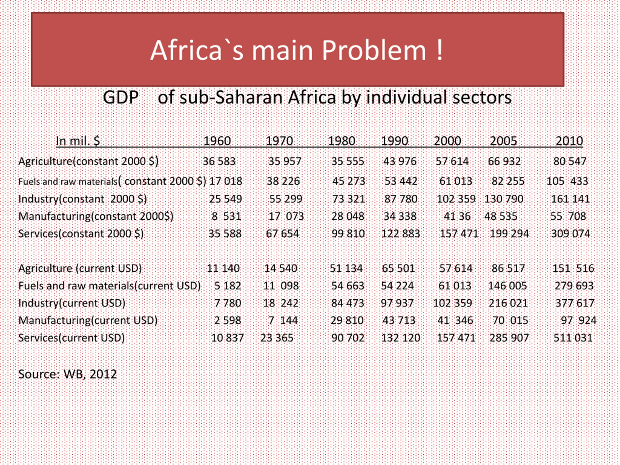 Africa`s main Problem ! GDP of sub-Saharan Africa by individual sectors In mil. $ 1960 1970 1980 1990 2000 2005 2010 Agriculture(constant 2000 $) 36 583 35 957 35 555 43 976 57 614 66 932 80 547 Fuels and raw materials( constant 2000 $) 17 018 38 226 45 273 53 442 61 013 82 255 105 433 Industry(constant 2000 $) 25 549 55 299 73 321 87 780 102 359 130 790 Manufacturing(constant 2000$) 8 531 17 073 28 048 34 338 41 36 48 535 Services(constant 2000 $) 35 588 67 654 99 810 122 883 157 471 199 294 161 141 55 708 309 074 Agriculture (current USD) 11 140 14 540 51 134 65 501 57 614 86 517 151 516 Fuels and raw materials(current USD) 5 182 11 098 54 663 54 224 61 013 146 005 Industry(current USD) 7 780 18 242 84 473 97 937 102 359 216 021 377 617 Manufacturing(current USD) 2 598 7 144 29 810 43 713 41 346 70 015 Services(current USD) 10 837 23 365 90 702 132 120 157 471 285 907 511 031 279 693 97 924 Source: WB, 2012