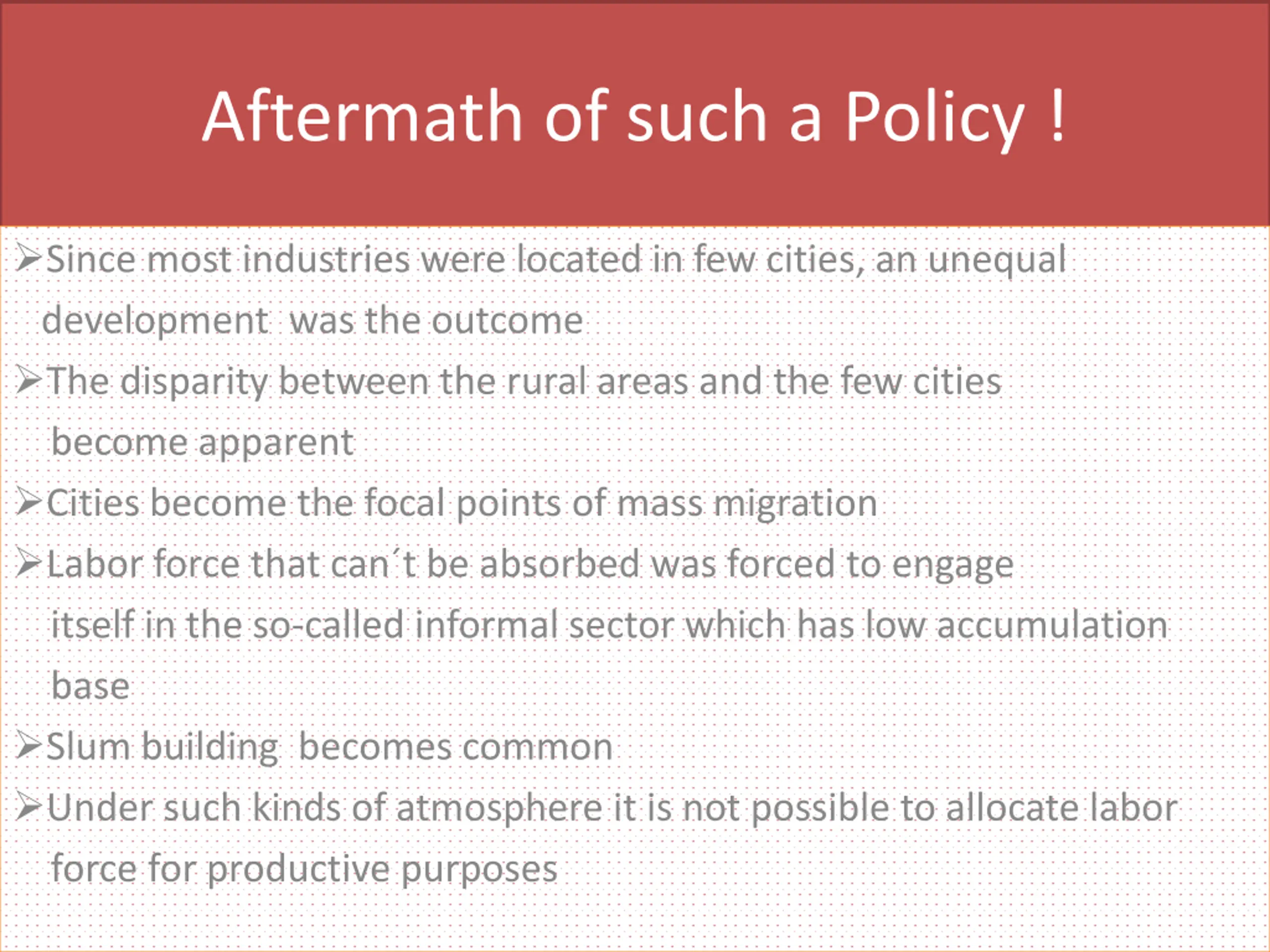 Aftermath of such a Policy ! Since most industries were located in few cities, an unequal development was the outcome The disparity between the rural areas and the few cities become apparent Cities become the focal points of mass migration Labor force that can t be absorbed was forced to engage itself in the so-called informal sector which has low accumulation base Slum building becomes common Under such kinds of atmosphere it is not possible to allocate labor force for productive purposes