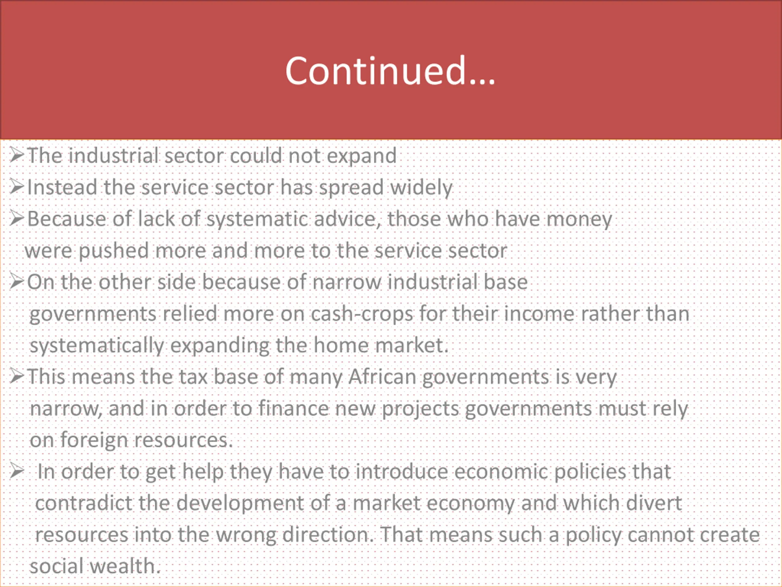Continued The industrial sector could not expand Instead the service sector has spread widely Because of lack of systematic advice, those who have money were pushed more and more to the service sector On the other side because of narrow industrial base governments relied more on cash-crops for their income rather than systematically expanding the home market. This means the tax base of many African governments is very narrow, and in order to finance new projects governments must rely on foreign resources. In order to get help they have to introduce economic policies that contradict the development of a market economy and which divert resources into the wrong direction. That means such a policy cannot create social wealth.