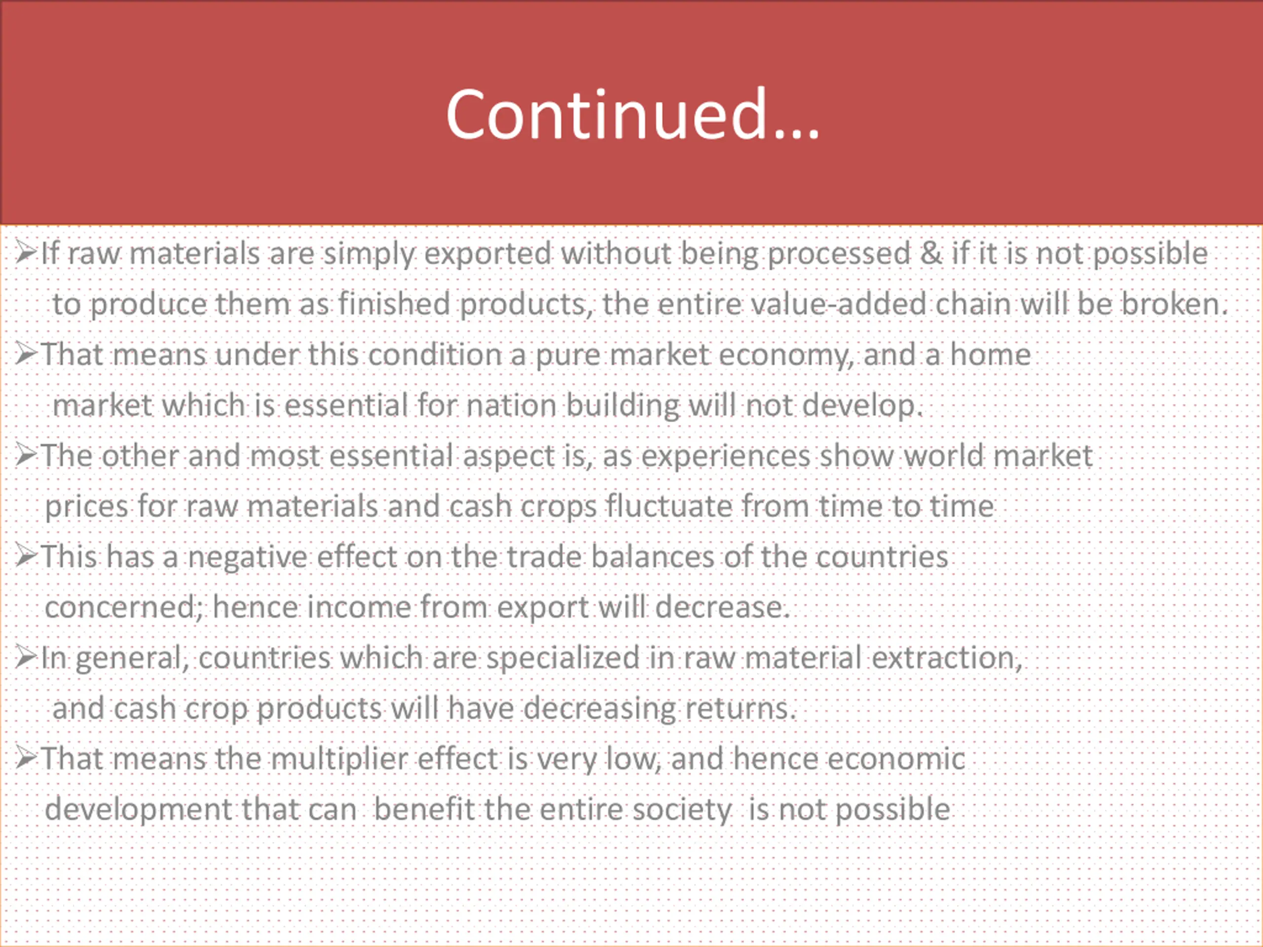 Continued If raw materials are simply exported without being processed & if it is not possible to produce them as finished products, the entire value-added chain will be broken. That means under this condition a pure market economy, and a home market which is essential for nation building will not develop. The other and most essential aspect is, as experiences show world market prices for raw materials and cash crops fluctuate from time to time This has a negative effect on the trade balances of the countries concerned; hence income from export will decrease. In general, countries which are specialized in raw material extraction, and cash crop products will have decreasing returns. That means the multiplier effect is very low, and hence economic development that can benefit the entire society is not possible