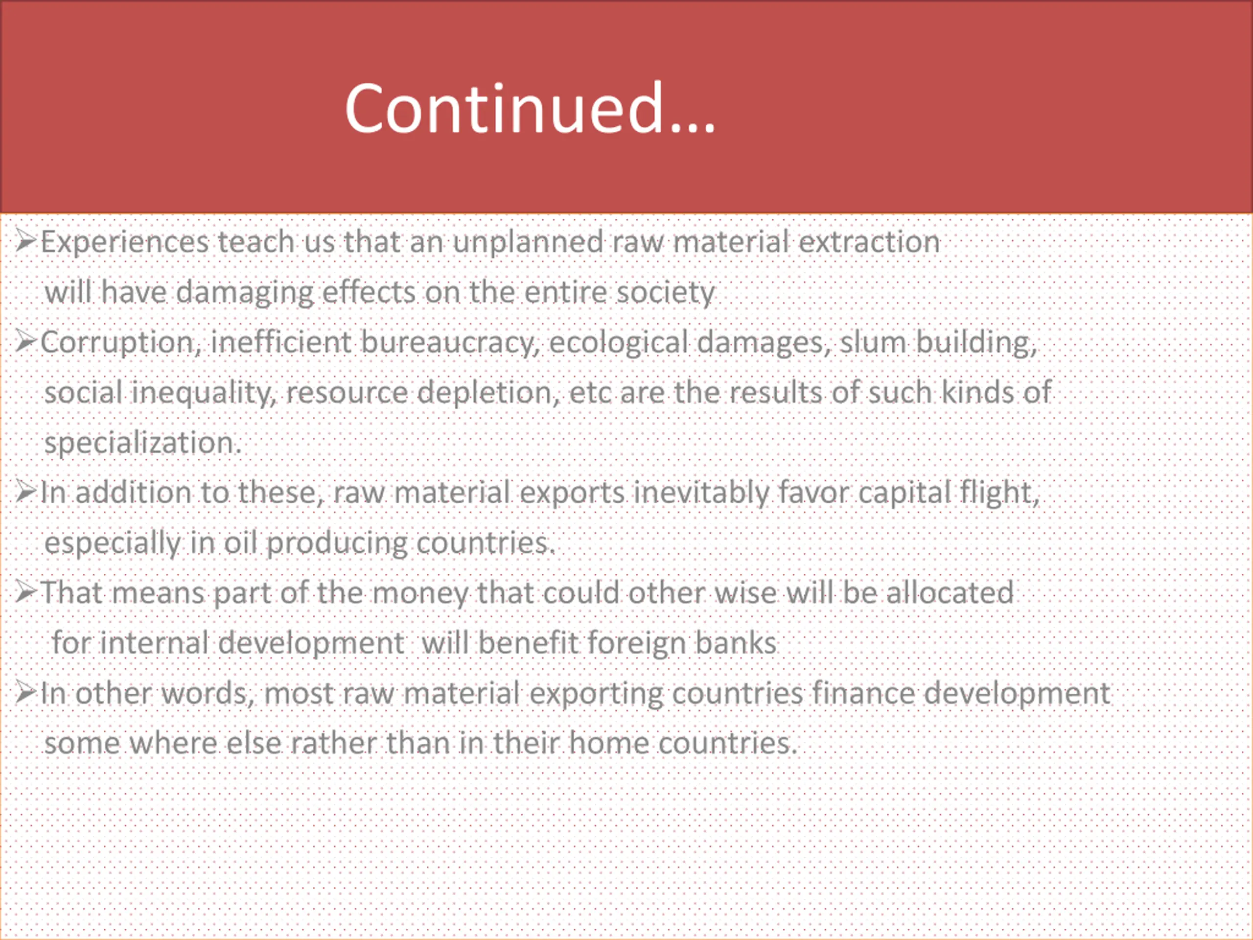 Continued Experiences teach us that an unplanned raw material extraction will have damaging effects on the entire society Corruption, inefficient bureaucracy, ecological damages, slum building, social inequality, resource depletion, etc are the results of such kinds of specialization. In addition to these, raw material exports inevitably favor capital flight, especially in oil producing countries. That means part of the money that could other wise will be allocated for internal development will benefit foreign banks In other words, most raw material exporting countries finance development some where else rather than in their home countries.