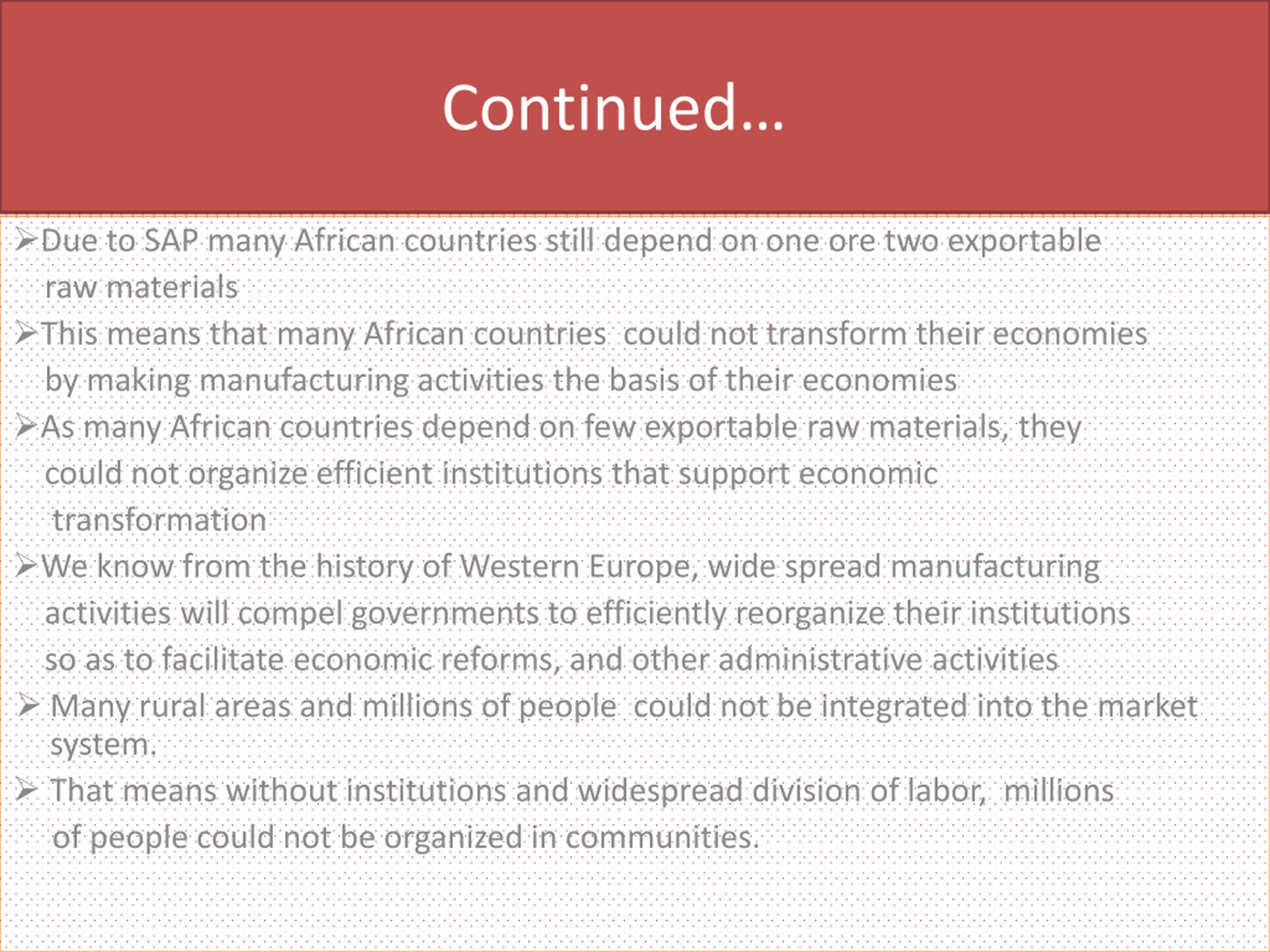 Continued Due to SAP many African countries still depend on one ore two exportable raw materials This means that many African countries could not transform their economies by making manufacturing activities the basis of their economies As many African countries depend on few exportable raw materials, they could not organize efficient institutions that support economic transformation We know from the history of Western Europe, wide spread manufacturing activities will compel governments to efficiently reorganize their institutions so as to facilitate economic reforms, and other administrative activities Many rural areas and millions of people could not be integrated into the market system. That means without institutions and widespread division of labor, millions of people could not be organized in communities.