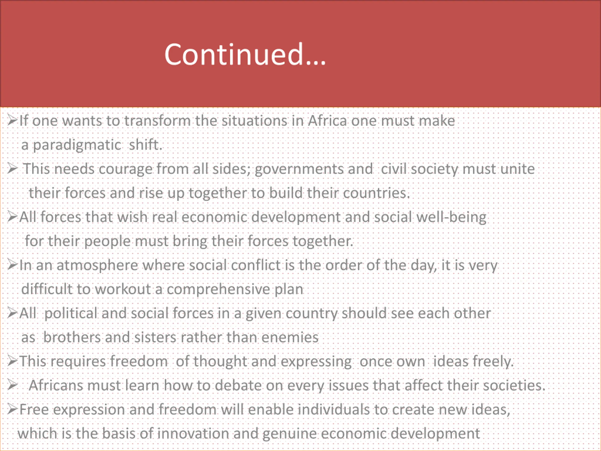 Continued If one wants to transform the situations in Africa one must make a paradigmatic shift. This needs courage from all sides; governments and civil society must unite their forces and rise up together to build their countries. All forces that wish real economic development and social well-being for their people must bring their forces together. In an atmosphere where social conflict is the order of the day, it is very difficult to workout a comprehensive plan All political and social forces in a given country should see each other as brothers and sisters rather than enemies This requires freedom of thought and expressing once own ideas freely. Africans must learn how to debate on every issues that affect their societies. Free expression and freedom will enable individuals to create new ideas, which is the basis of innovation and genuine economic development