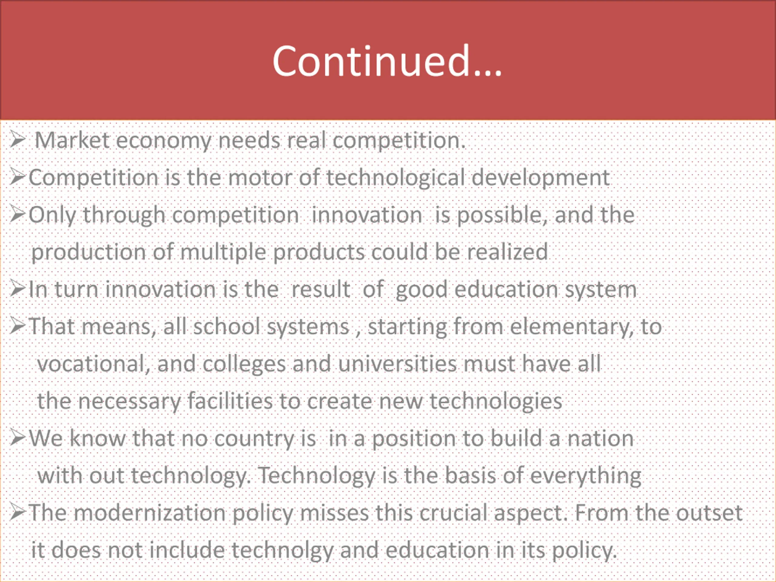 Continued Market economy needs real competition. Competition is the motor of technological development Only through competition innovation is possible, and the production of multiple products could be realized In turn innovation is the result of good education system That means, all school systems , starting from elementary, to vocational, and colleges and universities must have all the necessary facilities to create new technologies We know that no country is in a position to build a nation with out technology. Technology is the basis of everything The modernization policy misses this crucial aspect. From the outset it does not include technolgy and education in its policy.