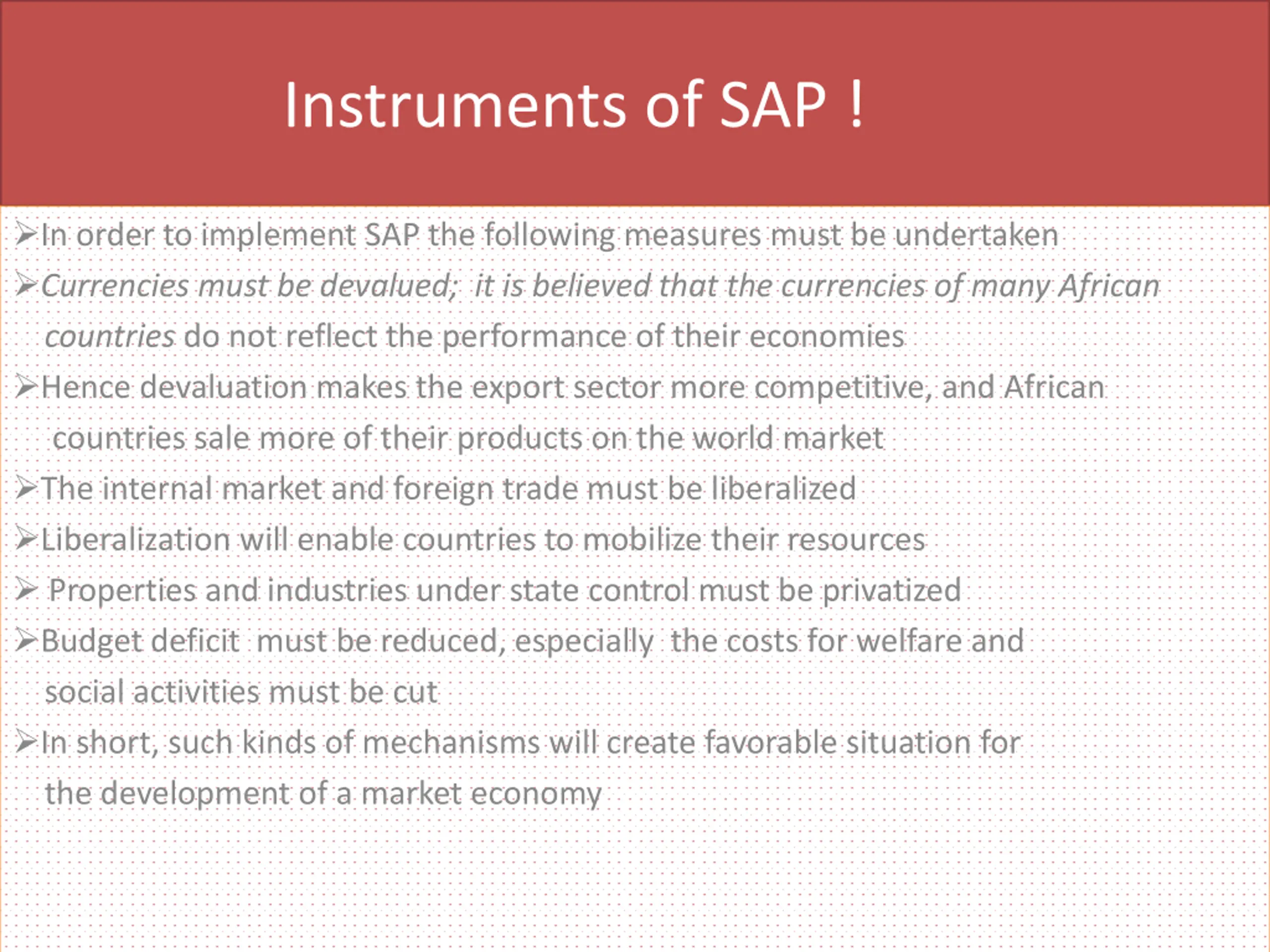 Instruments of SAP ! In order to implement SAP the following measures must be undertaken Currencies must be devalued; it is believed that the currencies of many African countries do not reflect the performance of their economies Hence devaluation makes the export sector more competitive, and African countries sale more of their products on the world market The internal market and foreign trade must be liberalized Liberalization will enable countries to mobilize their resources Properties and industries under state control must be privatized Budget deficit must be reduced, especially the costs for welfare and social activities must be cut In short, such kinds of mechanisms will create favorable situation for the development of a market economy