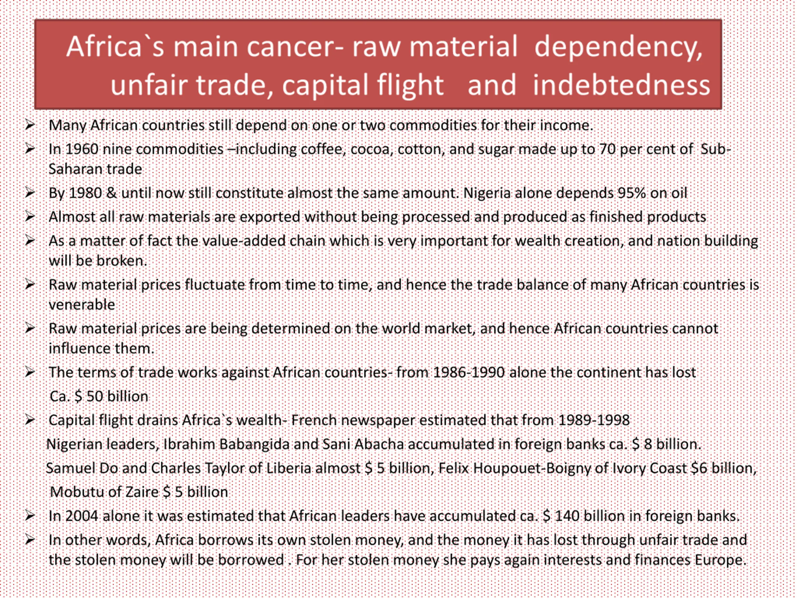 Many African countries still depend on one or two commodities for their income. In 1960 nine commodities including coffee, cocoa, cotton, and sugar made up to 70 per cent of Sub- Saharan trade By 1980 & until now still constitute almost the same amount. Nigeria alone depends 95% on oil Almost all raw materials are exported without being processed and produced as finished products As a matter of fact the value-added chain which is very important for wealth creation, and nation building will be broken. Raw material prices fluctuate from time to time, and hence the trade balance of many African countries is venerable Raw material prices are being determined on the world market, and hence African countries cannot influence them. The terms of trade works against African countries- from 1986-1990 alone the continent has lost Ca. $ 50 billion Capital flight drains Africa`s wealth- French newspaper estimated that from 1989-1998 Nigerian leaders, Ibrahim Babangida and Sani Abacha accumulated in foreign banks ca. $ 8 billion. Samuel Do and Charles Taylor of Liberia almost $ 5 billion, Felix Houpouet-Boignyof Ivory Coast $6 billion, Mobutu of Zaire $ 5 billion In 2004 alone it was estimated that African leaders have accumulated ca. $ 140 billion in foreign banks. In other words, Africa borrows its own stolen money, and the money it has lost through unfair trade and the stolen money will be borrowed . For her stolen money she pays again interests and finances Europe.