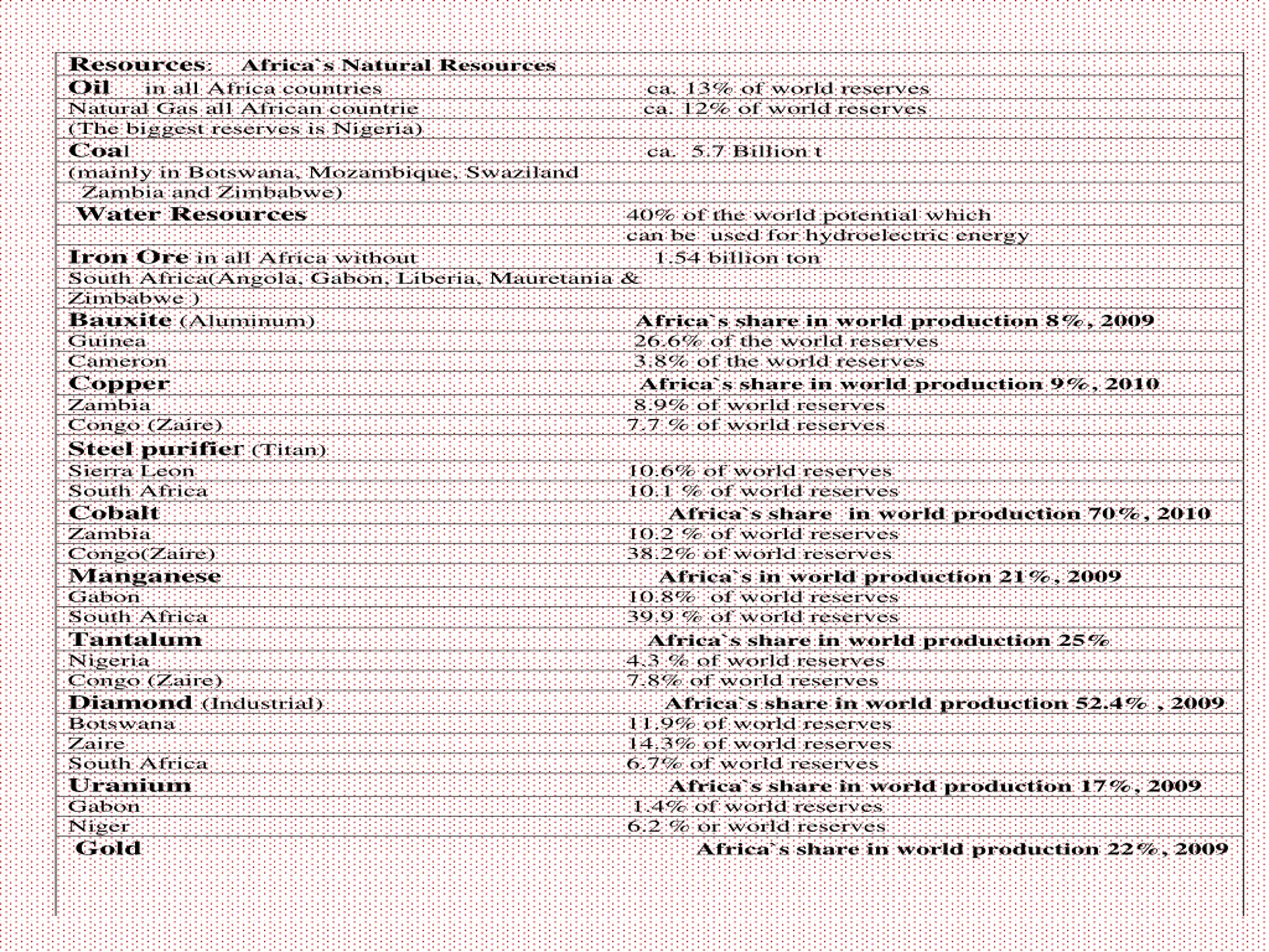 Resources: Africa`s Natural Resources Oil in all Africa countries ca. 13% of world reserves Natural Gas all African countrie ca. 12% of world reserves (The biggest reserves is Nigeria) Coal (mainly in Botswana, Mozambique, Swaziland Zambia and Zimbabwe) Water Resources Iron Ore in all Africa without 1.54 billion ton South Africa(Angola, Gabon, Liberia, Mauretania & Zimbabwe ) Bauxite (Aluminum) Africa`s share in world production 8%, 2009 Guinea 26.6% of the world reserves Cameron 3.8% of the world reserves Copper Africa`s share in world production 9%, 2010 Zambia 8.9% of world reserves Congo (Zaire) 7.7 % of world reserves Steelpurifier (Titan) Sierra Leon 10.6% of world reserves South Africa 10.1 % of world reserves Cobalt Africa`s sharein world production 70%, 2010 Zambia 10.2 % of world reserves Congo(Zaire) 38.2% of world reserves Manganese Africa`s in world production 21%, 2009 Gabon 10.8% of world reserves South Africa 39.9 % of world reserves Tantalum Africa`s share in world production 25% Nigeria 4.3 % of world reserves Congo (Zaire) 7.8% of world reserves Diamond (Industrial) Africa`s share in world production 52.4% , 2009 Botswana 11.9% of world reserves Zaire 14.3% of world reserves South Africa 6.7% of world reserves Uranium Africa`s share in world production 17%, 2009 Gabon 1.4% of world reserves Niger 6.2 % or world reserves Gold Africa`s share in world production 22%, 2009 ca. 5.7 Billion t 40% of the world potential which can be used for hydroelectric energy