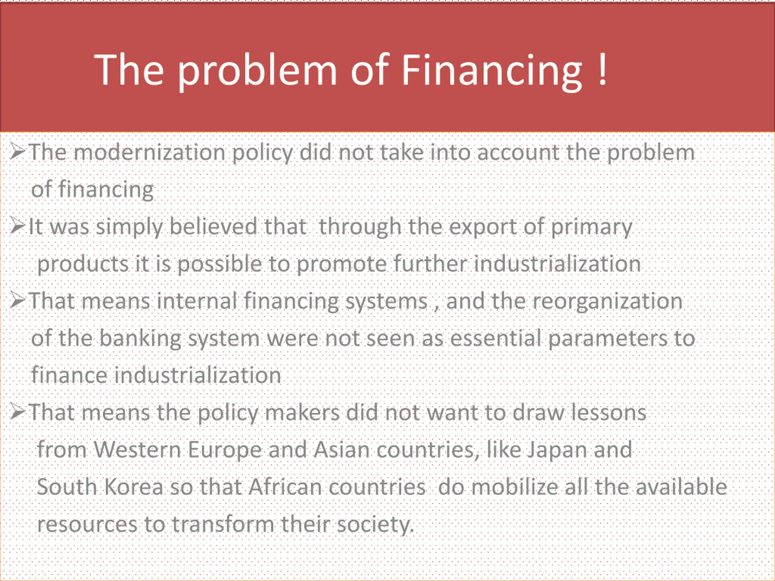 The problem of Financing ! The modernization policy did not take into account the problem of financing It was simply believed that through the export of primary products it is possible to promote further industrialization That means internal financing systems , and the reorganization of the banking system were not seen as essential parameters to finance industrialization That means the policy makers did not want to draw lessons from Western Europe and Asian countries, like Japan and South Korea so that African countries do mobilize all the available resources to transform their society.
