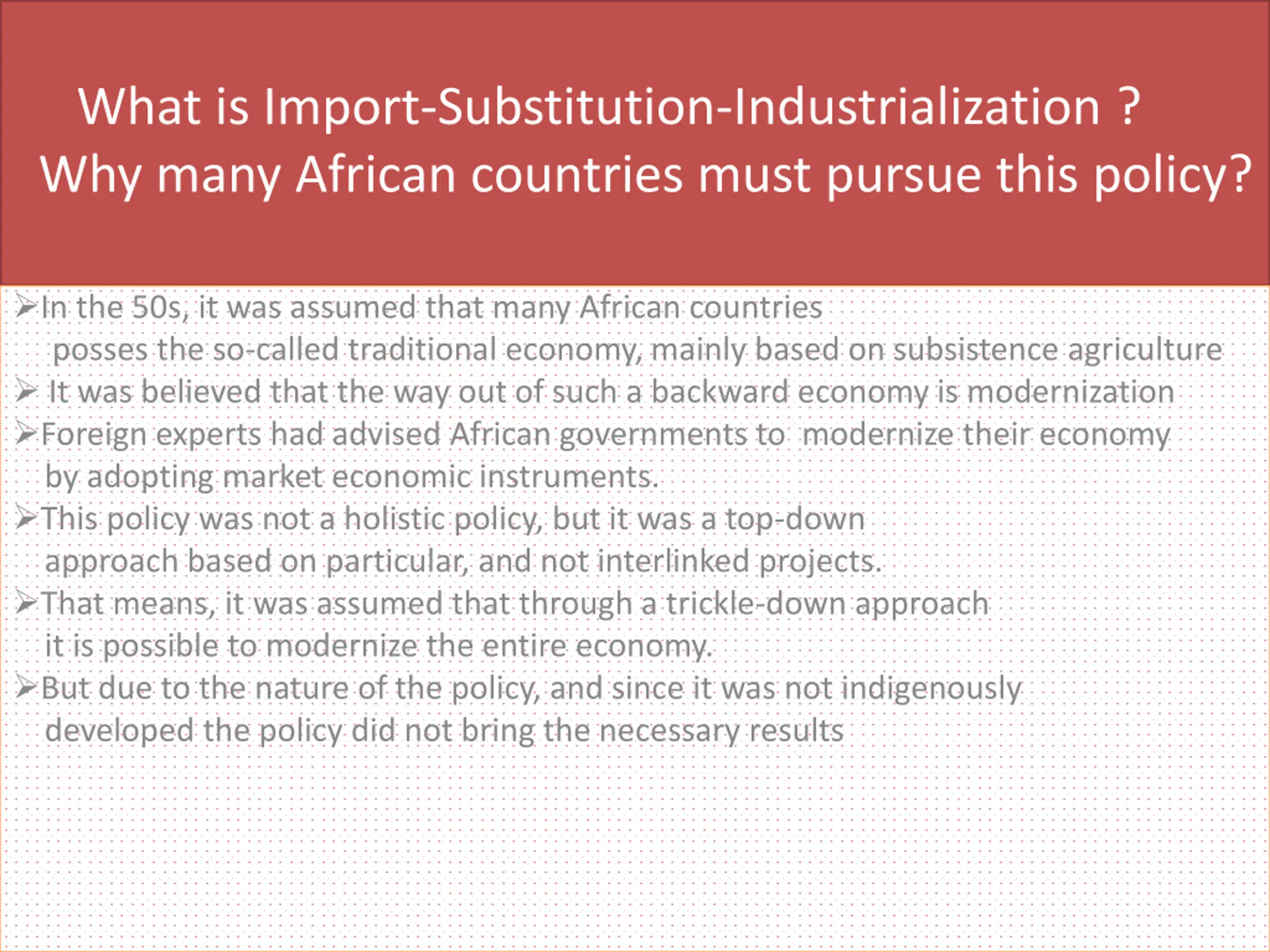What is Import-Substitution-Industrialization ? Why many African countries must pursue this policy? In the 50s, it was assumed that many African countries posses the so-called traditional economy, mainly based on subsistence agriculture It was believed that the way out of such a backward economy is modernization Foreign experts had advised African governments to modernize their economy by adopting market economic instruments. This policy was not a holistic policy, but it was a top-down approach based on particular, and not interlinked projects. That means, it was assumed that through a trickle-down approach it is possible to modernize the entire economy. But due to the nature of the policy, and since it was not indigenously developed the policy did not bring the necessary results