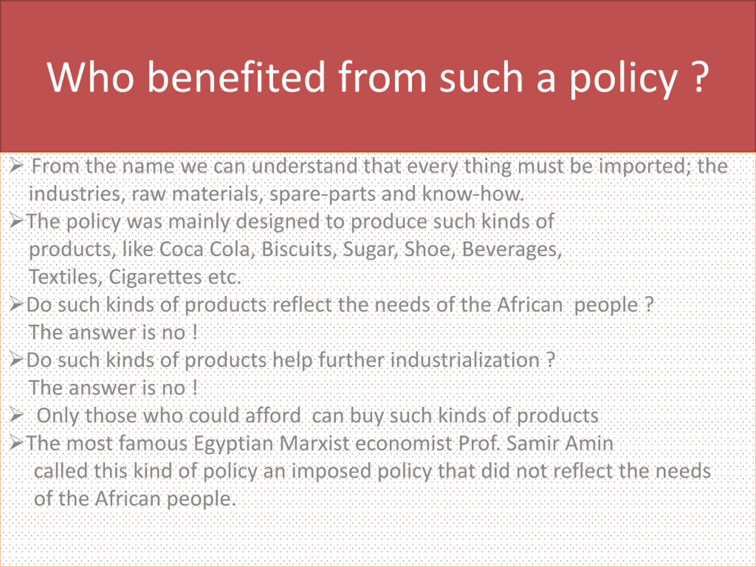 Who benefited from such a policy ? From the name we can understand that every thing must be imported; the industries, raw materials, spare-parts and know-how. The policy was mainly designed to produce such kinds of products, like Coca Cola, Biscuits, Sugar, Shoe, Beverages, Textiles, Cigarettes etc. Do such kinds of products reflect the needs of the African people ? The answer is no ! Do such kinds of products help further industrialization ? The answer is no ! Only those who could afford can buy such kinds of products The most famous Egyptian Marxist economist Prof. Samir Amin called this kind of policy an imposed policy that did not reflect the needs of the African people.