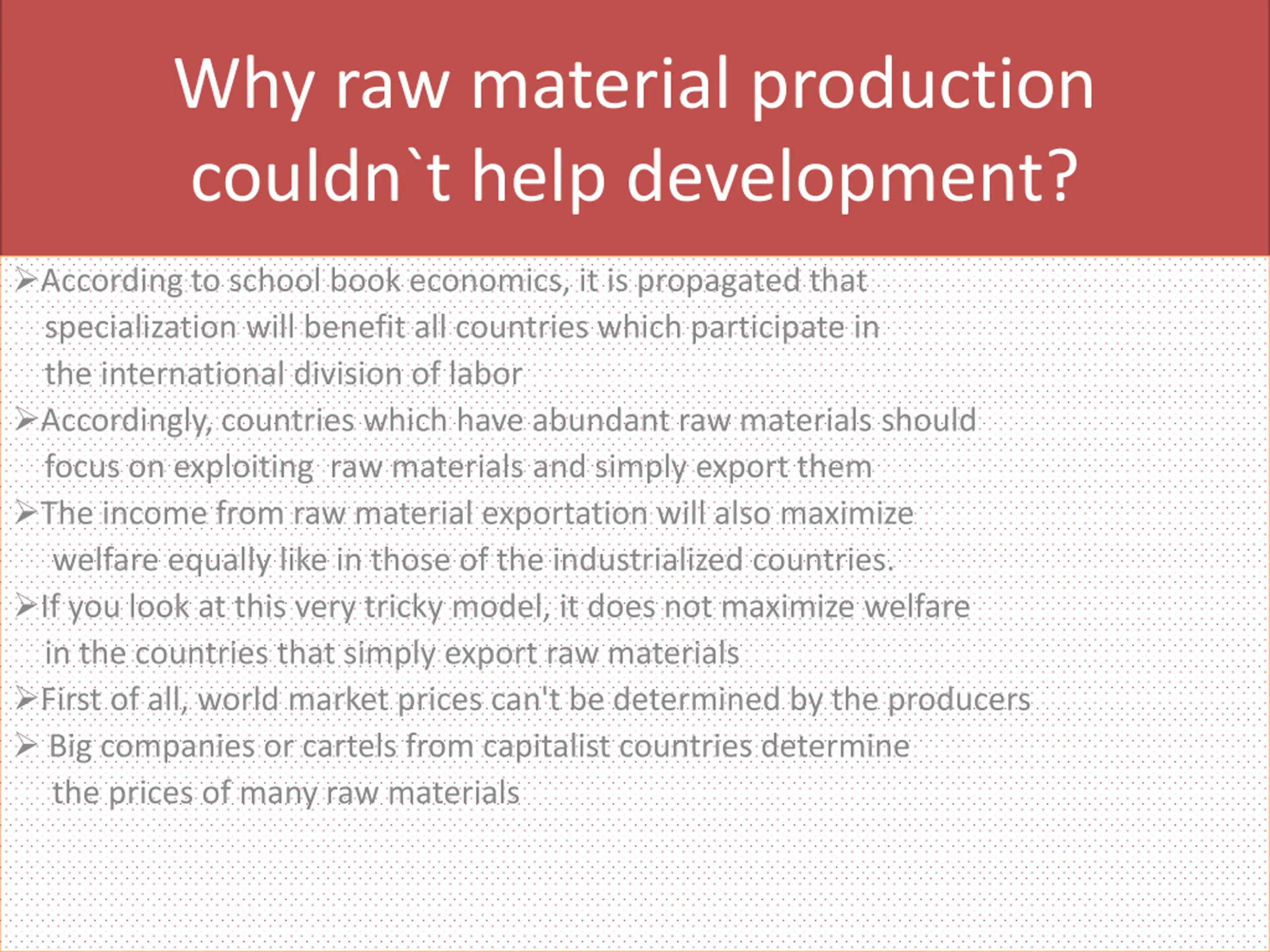 Why raw material production couldn`t help development? According to school book economics, it is propagated that specialization will benefit all countries which participate in the international division of labor Accordingly, countries which have abundant raw materials should focus on exploiting raw materials and simply export them The income from raw material exportation will also maximize welfare equally like in those of the industrialized countries. If you look at this very tricky model, it does not maximize welfare in the countries that simply export raw materials First of all, world market prices can't be determined by the producers Big companies or cartels from capitalist countries determine the prices of many raw materials