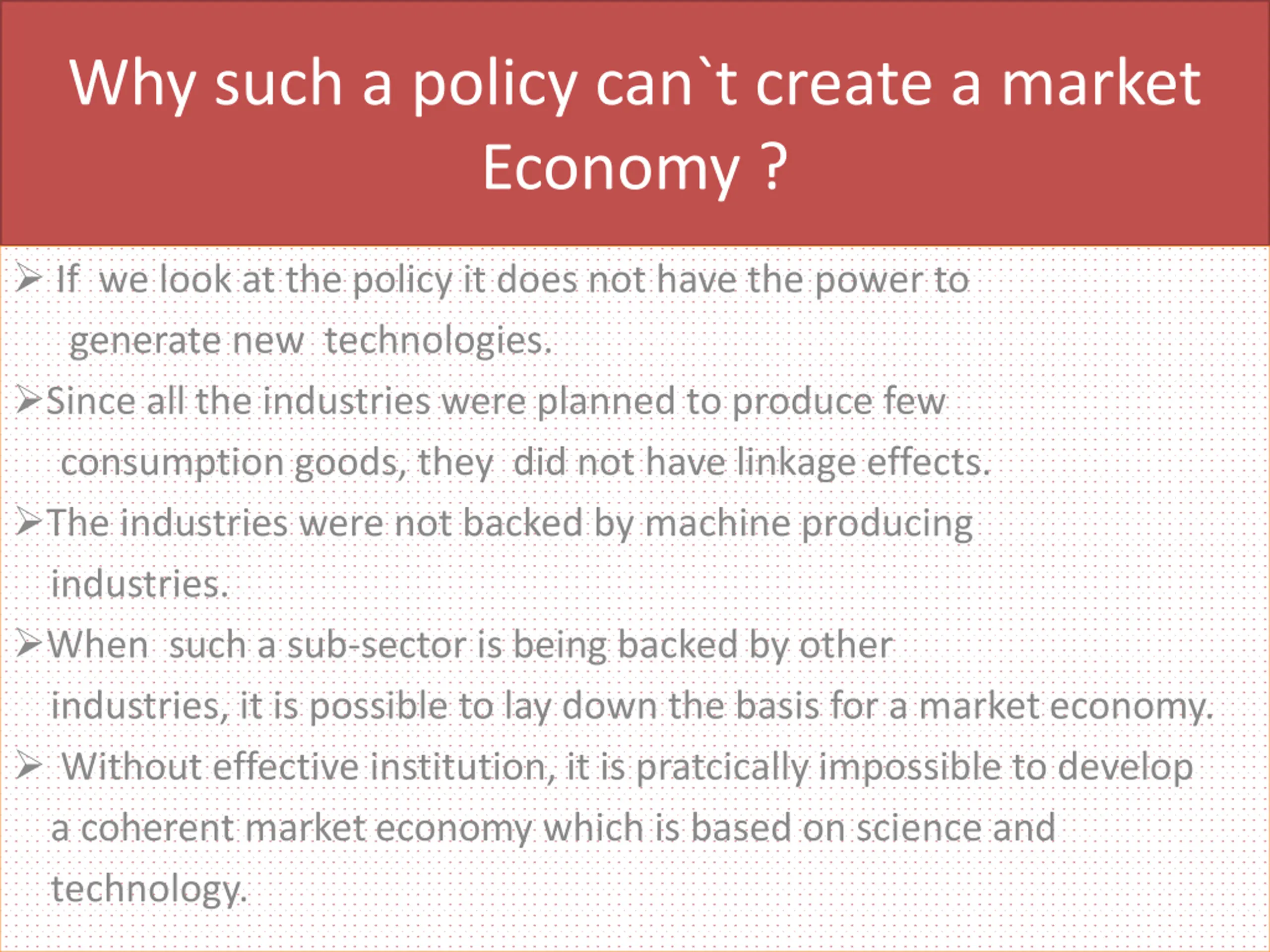 Why such a policy can`t create a market Economy ? If we look at the policy it does not have the power to generate new technologies. Since all the industries were planned to produce few consumption goods, they did not have linkage effects. The industries were not backed by machine producing industries. When such a sub-sector is being backed by other industries, it is possible to lay down the basis for a market economy. Without effective institution, it is pratcically impossible to develop a coherent market economy which is based on science and technology.