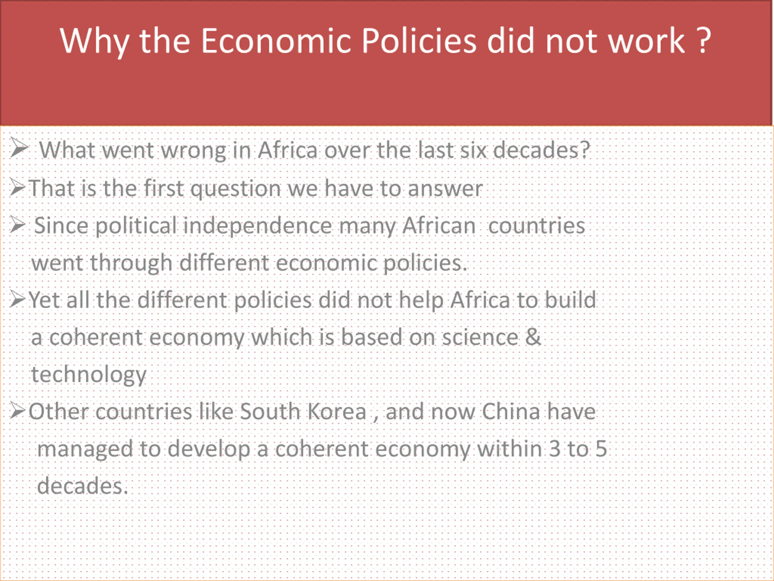 Why the Economic Policies did not work ? What went wrong in Africa over the last six decades? That is the first question we have to answer Since political independence many African countries went through different economic policies. Yet all the different policies did not help Africa to build a coherent economy which is based on science & technology Other countries like South Korea , and now China have managed to develop a coherent economy within 3 to 5 decades.