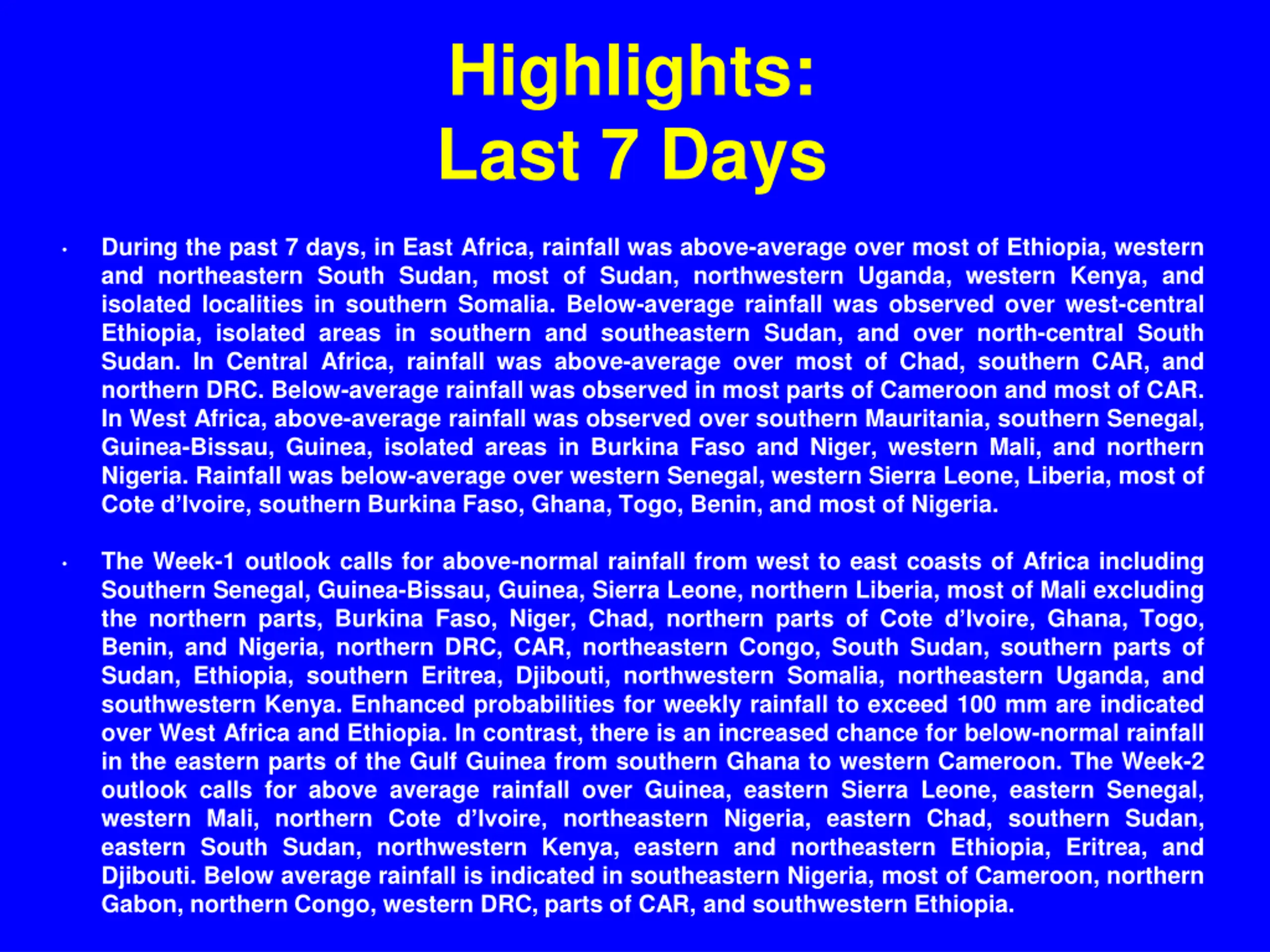 Highlights: Last 7 Days During the past 7 days, in East Africa, rainfall was above-average over most of Ethiopia, western and northeastern South Sudan, most of Sudan, northwestern Uganda, western Kenya, and isolated localities in southern Somalia. Below-average rainfall was observed over west-central Ethiopia, isolated areas in southern and southeastern Sudan, and over north-central South Sudan. In Central Africa, rainfall was above-average over most of Chad, southern CAR, and northern DRC. Below-average rainfall was observed in most parts of Cameroon and most of CAR. In West Africa, above-average rainfall was observed over southern Mauritania, southern Senegal, Guinea-Bissau, Guinea, isolated areas in Burkina Faso and Niger, western Mali, and northern Nigeria. Rainfall was below-average over western Senegal, western Sierra Leone, Liberia, most of Cote d Ivoire, southern Burkina Faso, Ghana, Togo, Benin, and most of Nigeria. The Week-1 outlook calls for above-normal rainfall from west to east coasts of Africa including Southern Senegal, Guinea-Bissau, Guinea, Sierra Leone, northern Liberia, most of Mali excluding the northern parts, Burkina Faso, Niger, Chad, northern parts of Cote d Ivoire, Ghana, Togo, Benin, and Nigeria, northern DRC, CAR, northeastern Congo, South Sudan, southern parts of Sudan, Ethiopia, southern Eritrea, Djibouti, northwestern Somalia, northeastern Uganda, and southwestern Kenya. Enhanced probabilities for weekly rainfall to exceed 100 mm are indicated over West Africa and Ethiopia. In contrast, there is an increased chance for below-normal rainfall in the eastern parts of the Gulf Guinea from southern Ghana to western Cameroon. The Week-2 outlook calls for above average rainfall over Guinea, eastern Sierra Leone, eastern Senegal, western Mali, northern Cote d Ivoire, northeastern Nigeria, eastern Chad, southern Sudan, eastern South Sudan, northwestern Kenya, eastern and northeastern Ethiopia, Eritrea, and Djibouti. Below average rainfall is indicated in southeastern Nigeria, most of Cameroon, northern Gabon, northern Congo, western DRC, parts of CAR, and southwestern Ethiopia.