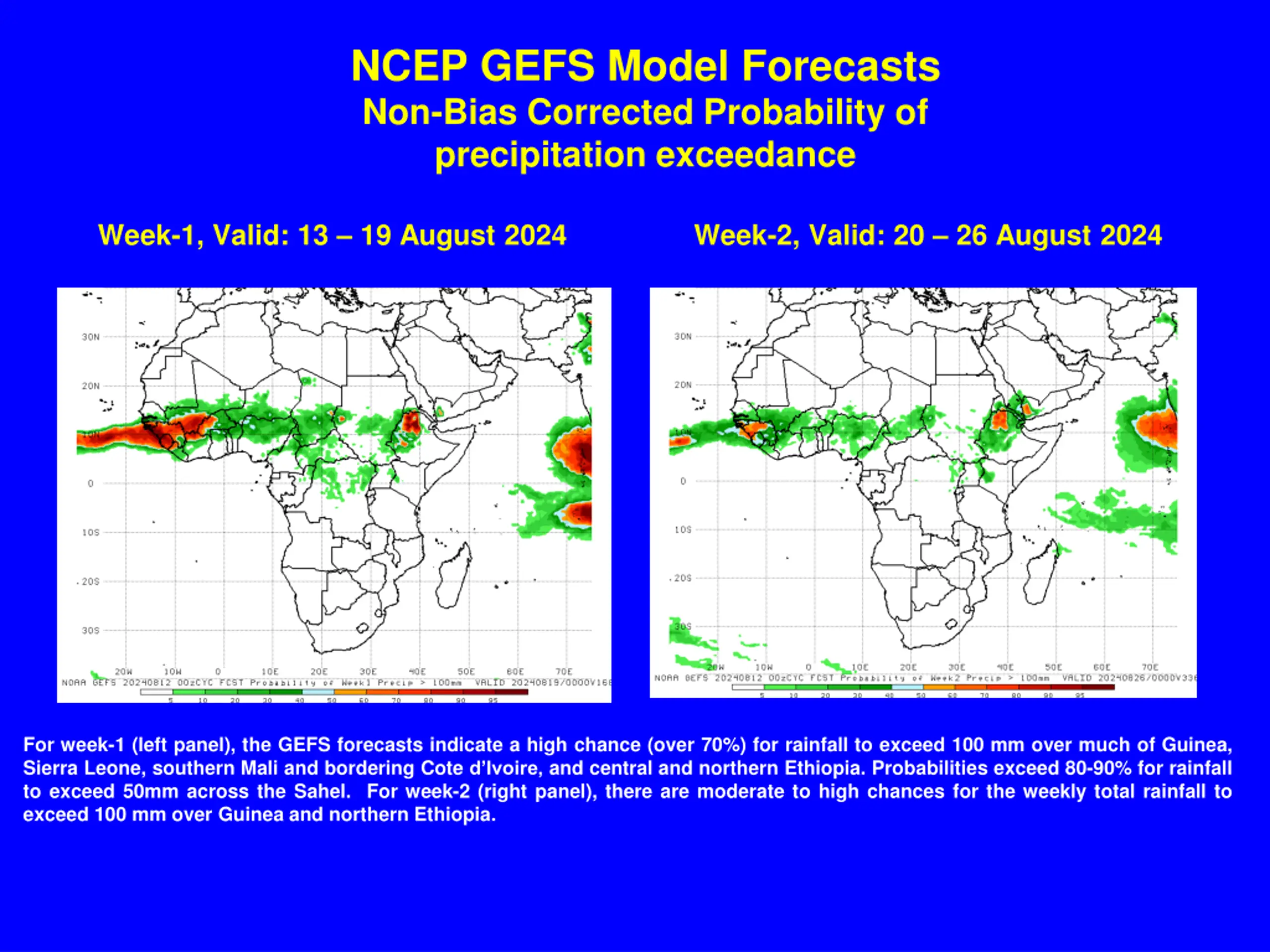 NCEP GEFS Model Forecasts Non-Bias Corrected Probability of precipitation exceedance Week-1, Valid: 13 19 August 2024 Week-2, Valid: 20 26 August 2024 For week-1 (left panel), the GEFS forecasts indicate a high chance (over 70%) for rainfall to exceed 100 mm over much of Guinea, Sierra Leone, southern Mali and bordering Cote d Ivoire, and central and northern Ethiopia. Probabilities exceed 80-90% for rainfall to exceed 50mm across the Sahel. For week-2 (right panel), there are moderate to high chances for the weekly total rainfall to exceed 100 mm over Guinea and northern Ethiopia.