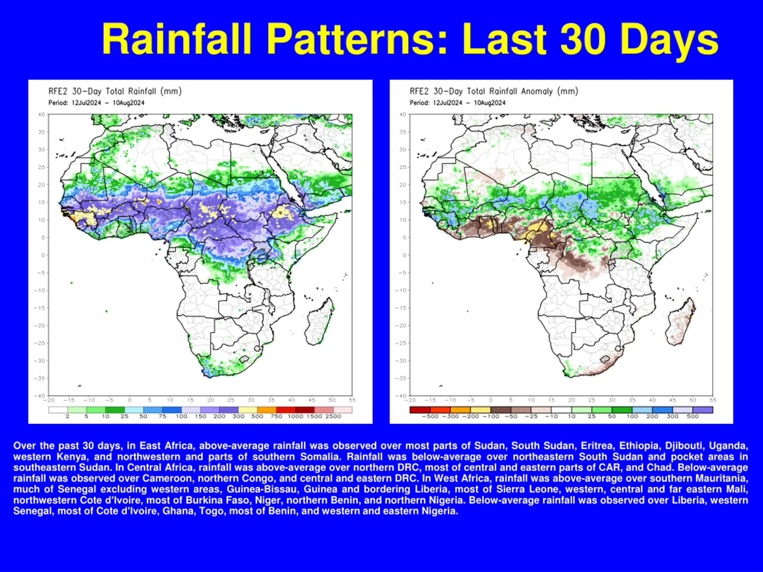 Rainfall Patterns: Last 30 Days Over the past 30 days, in East Africa, above-average rainfall was observed over most parts of Sudan, South Sudan, Eritrea, Ethiopia, Djibouti, Uganda, western Kenya, and northwestern and parts of southern Somalia. Rainfall was below-average over northeastern South Sudan and pocket areas in southeastern Sudan. In Central Africa, rainfall was above-average over northern DRC, most of central and eastern parts of CAR, and Chad. Below-average rainfall was observed over Cameroon, northern Congo, and central and eastern DRC. In West Africa, rainfall was above-average over southern Mauritania, much of Senegal excluding western areas, Guinea-Bissau, Guinea and bordering Liberia, most of Sierra Leone, western, central and far eastern Mali, northwestern Cote d Ivoire, most of Burkina Faso, Niger, northern Benin, and northern Nigeria. Below-average rainfall was observed over Liberia, western Senegal, most of Cote d Ivoire, Ghana, Togo, most of Benin, and western and eastern Nigeria.