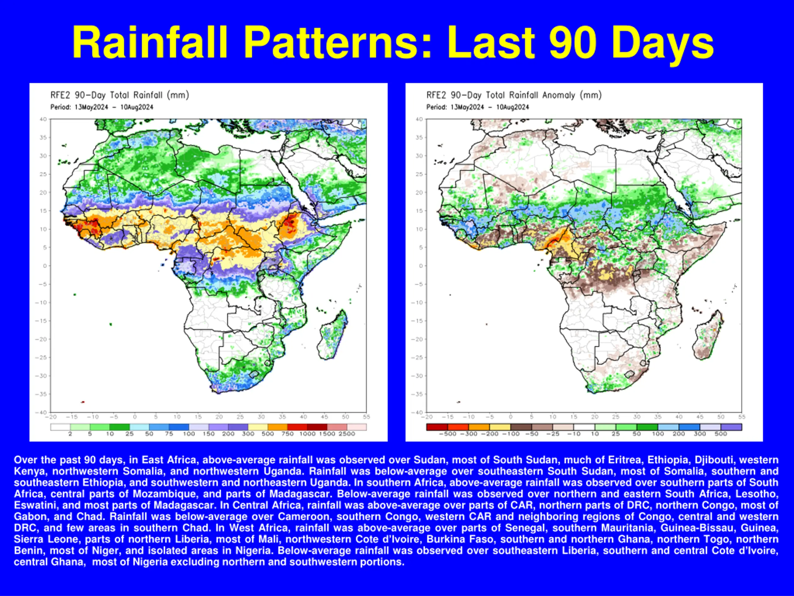 Rainfall Patterns: Last 90 Days Over the past 90 days, in East Africa, above-average rainfall was observed over Sudan, most of South Sudan, much of Eritrea, Ethiopia, Djibouti, western Kenya, northwestern Somalia, and northwestern Uganda. Rainfall was below-average over southeastern South Sudan, most of Somalia, southern and southeastern Ethiopia, and southwestern and northeastern Uganda. In southern Africa, above-average rainfall was observed over southern parts of South Africa, central parts of Mozambique, and parts of Madagascar. Below-average rainfall was observed over northern and eastern South Africa, Lesotho, Eswatini, and most parts of Madagascar. In Central Africa, rainfall was above-average over parts of CAR, northern parts of DRC, northern Congo, most of Gabon, and Chad. Rainfall was below-average over Cameroon, southern Congo, western CAR and neighboring regions of Congo, central and western DRC, and few areas in southern Chad. In West Africa, rainfall was above-average over parts of Senegal, southern Mauritania, Guinea-Bissau, Guinea, Sierra Leone, parts of northern Liberia, most of Mali, northwestern Cote d Ivoire, Burkina Faso, southern and northern Ghana, northern Togo, northern Benin, most of Niger, and isolated areas in Nigeria. Below-average rainfall was observed over southeastern Liberia, southern and central Cote d Ivoire, central Ghana, most of Nigeria excluding northern and southwestern portions.