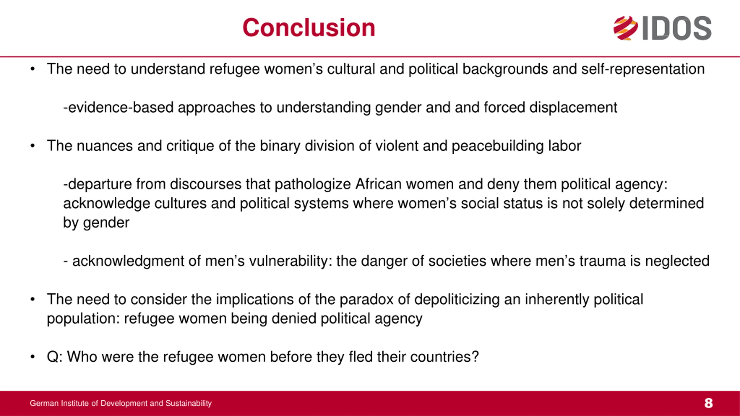 Conclusion The need to understand refugee women s cultural and political backgrounds and self-representation -evidence-based approaches to understanding gender and and forced displacement The nuances and critique of the binary division of violent and peacebuilding labor -departure from discourses that pathologize African women and deny them political agency: acknowledge cultures and political systems where women s social status is not solely determined by gender - acknowledgment of men s vulnerability: the danger of societies where men s trauma is neglected The need to consider the implications of the paradox of depoliticizing an inherently political population: refugee women being denied political agency Q: Who were the refugee women before they fled their countries? 8 German Institute of Development and Sustainability