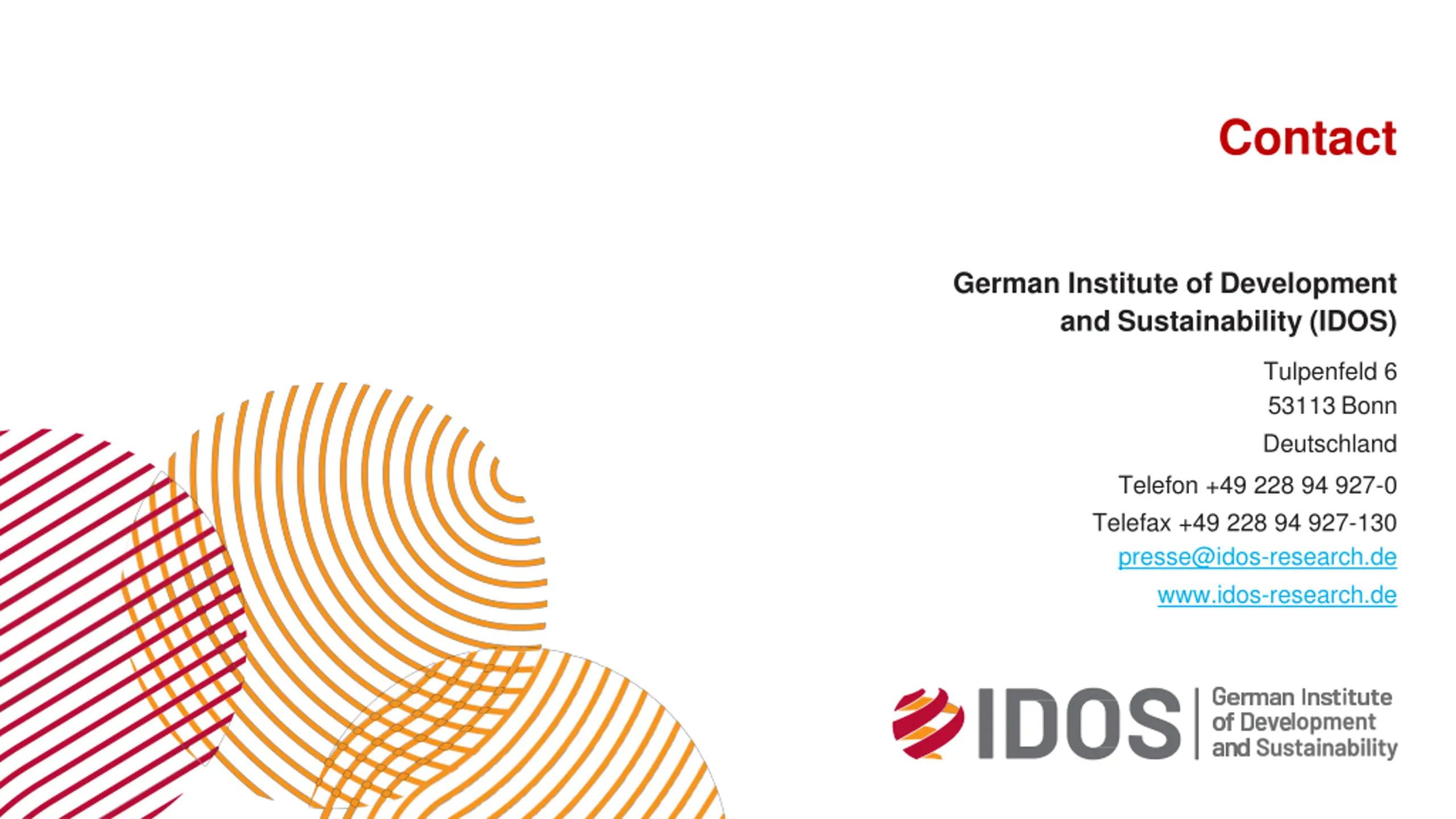 Contact German Institute of Development and Sustainability (IDOS) Tulpenfeld 6 53113 Bonn Deutschland Telefon +49 228 94 927-0 Telefax +49 228 94 927-130 presse@idos-research.de www.idos-research.de