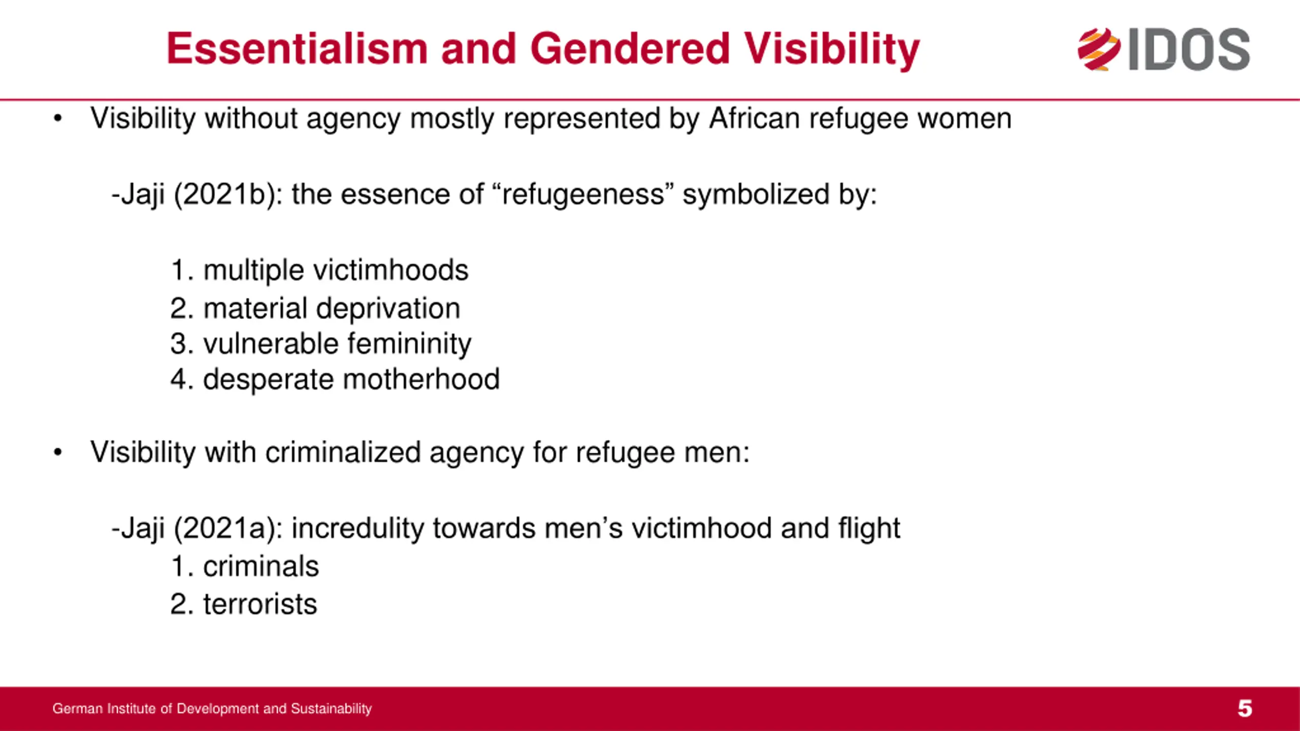 Essentialism and Gendered Visibility Visibility without agency mostly represented by African refugee women -Jaji (2021b): the essence of refugeeness symbolized by: 1. multiple victimhoods 2. material deprivation 3. vulnerable femininity 4. desperate motherhood Visibility with criminalized agency for refugee men: -Jaji (2021a): incredulity towards men s victimhood and flight 1. criminals 2. terrorists 5 German Institute of Development and Sustainability