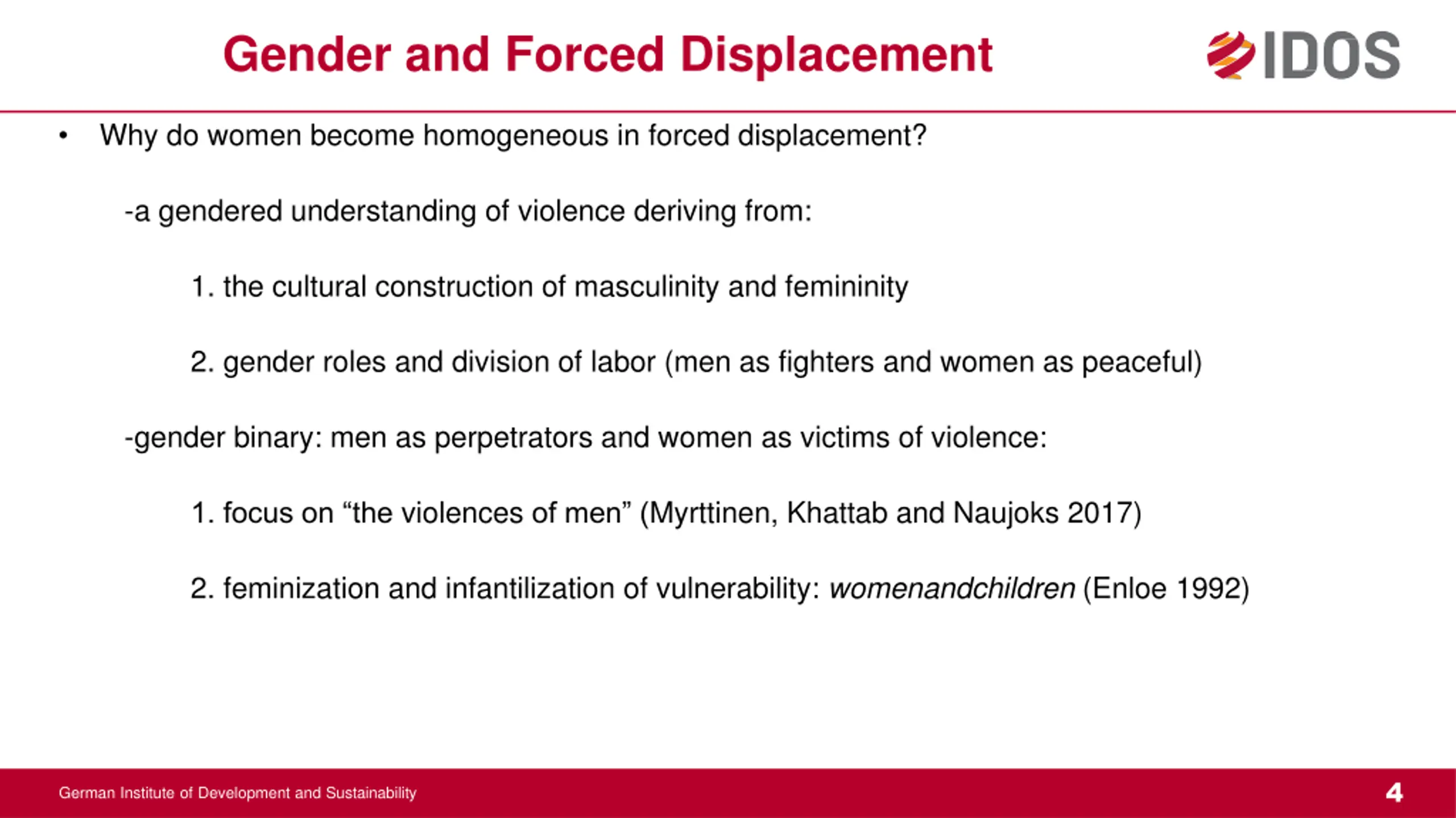 Gender and Forced Displacement Why do women become homogeneous in forced displacement? -a gendered understanding of violence deriving from: 1. the cultural construction of masculinity and femininity 2. gender roles and division of labor (men as fighters and women as peaceful) -gender binary: men as perpetrators and women as victims of violence: 1. focus on the violences of men (Myrttinen, Khattab and Naujoks 2017) 2. feminization and infantilization of vulnerability: womenandchildren (Enloe 1992) 4 German Institute of Development and Sustainability