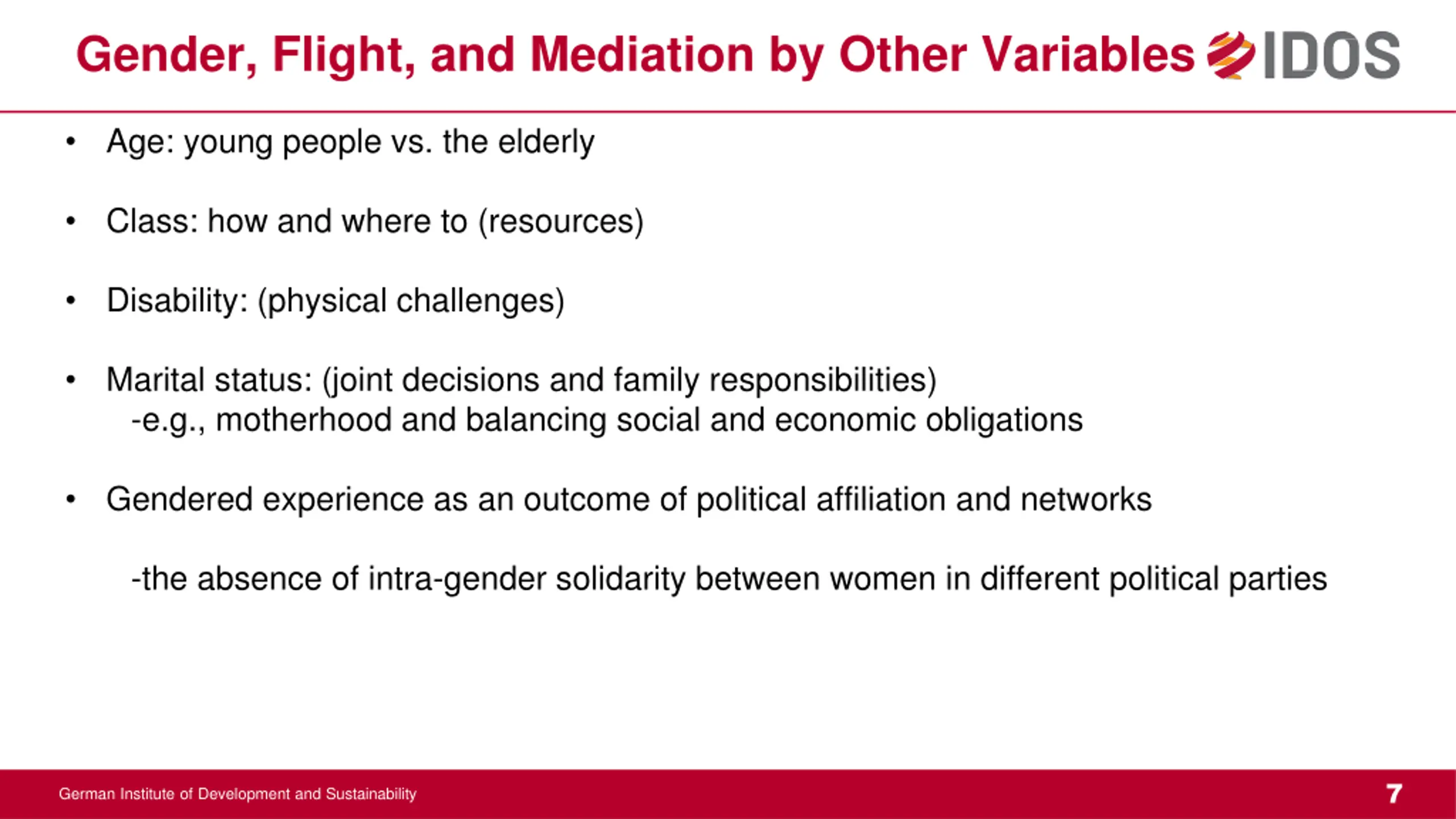 Gender, Flight, and Mediation by Other Variables Age: young people vs. the elderly Class: how and where to (resources) Disability: (physical challenges) Marital status: (joint decisions and family responsibilities) -e.g., motherhood and balancing social and economic obligations Gendered experience as an outcome of political affiliation and networks -the absence of intra-gender solidarity between women in different political parties 7 German Institute of Development and Sustainability