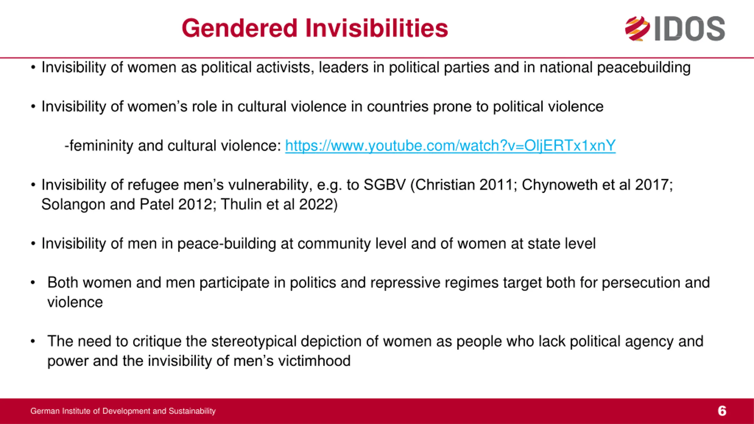 Gendered Invisibilities Invisibility of women as political activists, leaders in political parties and in national peacebuilding Invisibility of women s role in cultural violence in countries prone to political violence -femininity and cultural violence: https://www.youtube.com/watch?v=OljERTx1xnY Invisibility of refugee men s vulnerability, e.g. to SGBV (Christian 2011; Chynoweth et al 2017; Solangon and Patel 2012; Thulin et al 2022) Invisibility of men in peace-building at community level and of women at state level Both women and men participate in politics and repressive regimes target both for persecution and violence The need to critique the stereotypical depiction of women as people who lack political agency and power and the invisibility of men s victimhood 6 German Institute of Development and Sustainability